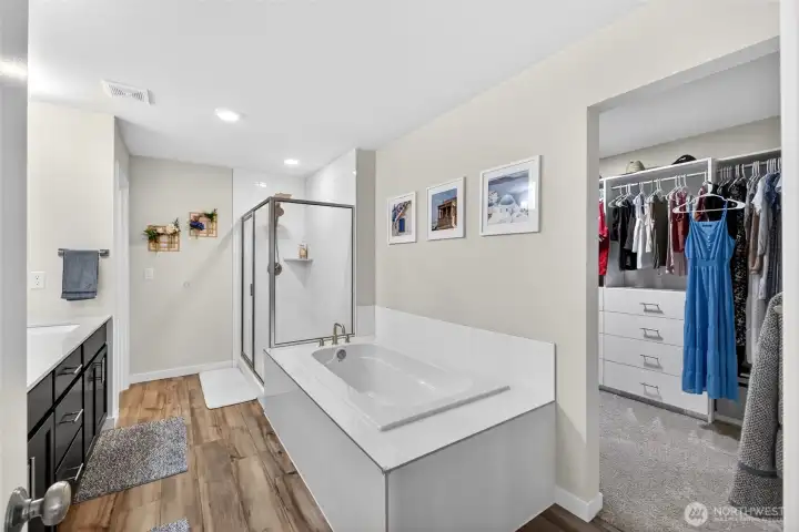 Dual vanities, built-in makeup station, soaking tub and separate shower