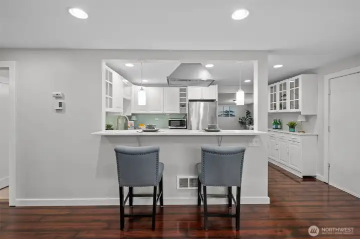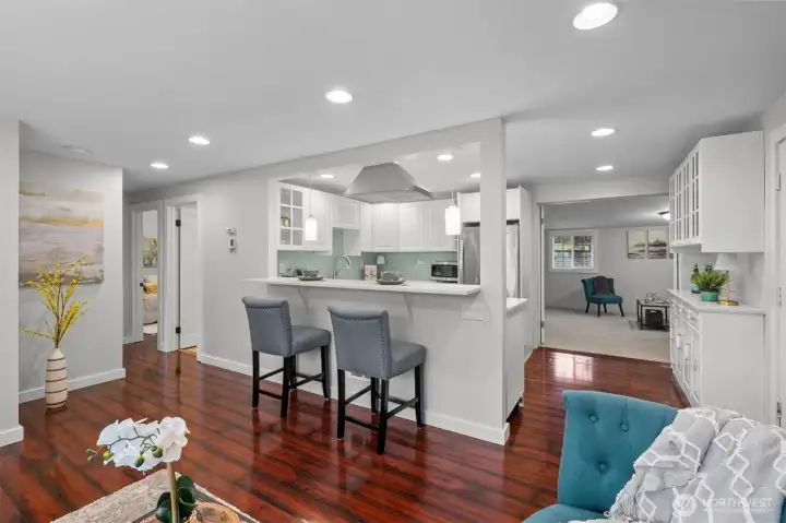 Kitchen with high bar seating area slows seamlessly to the living room.