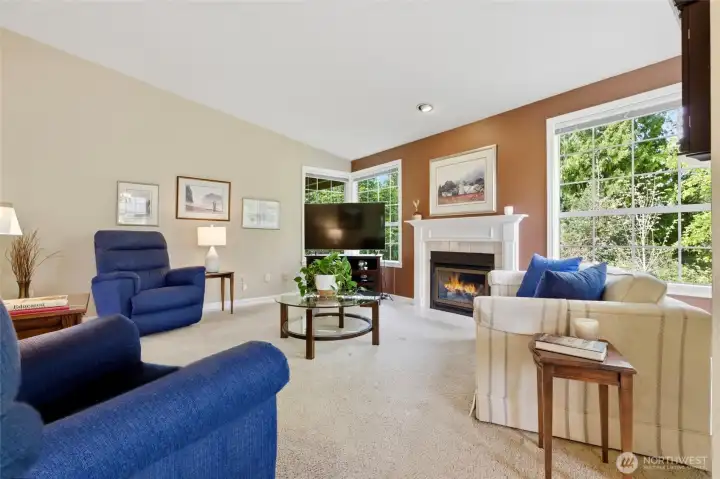 he beautifully spacious living room features a cozy gas fireplace—perfect for warming up on those colder evenings.