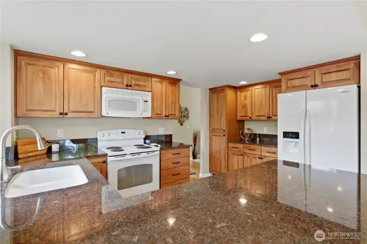 The inviting kitchen features hardwood floors, ample granite countertops and beautiful wooden cabinetry, offering both warmth and functionality.
