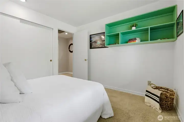 The second bedroom features a Murphy bed, offering a flexible space perfect for guests, a home office, or both.