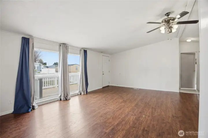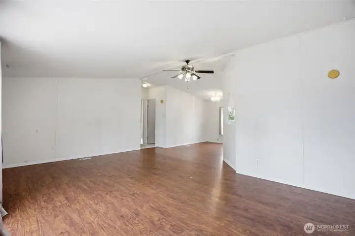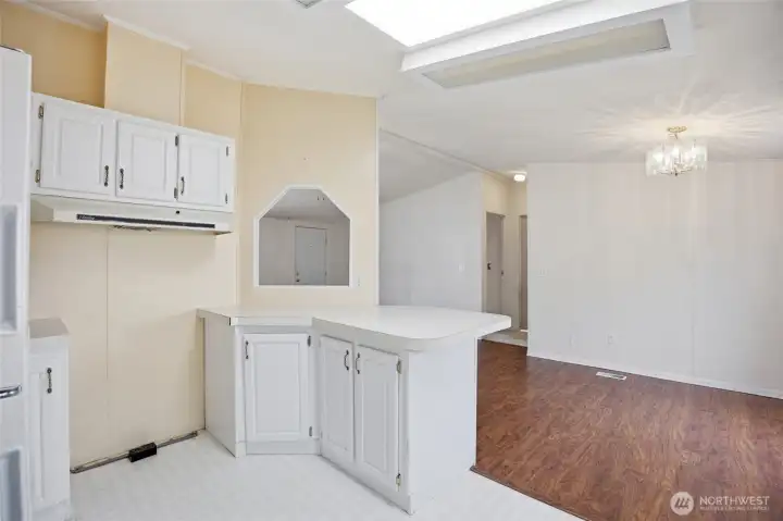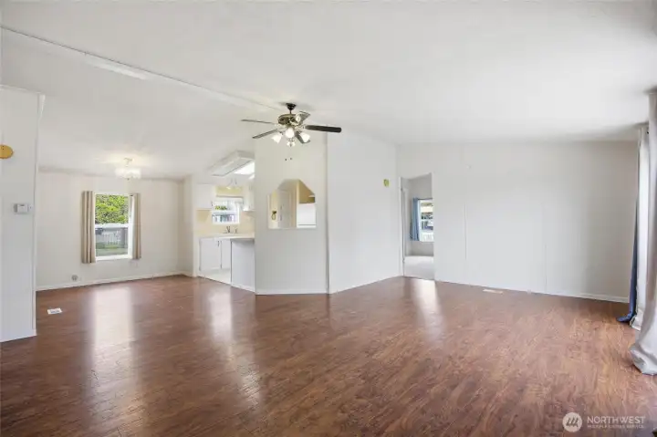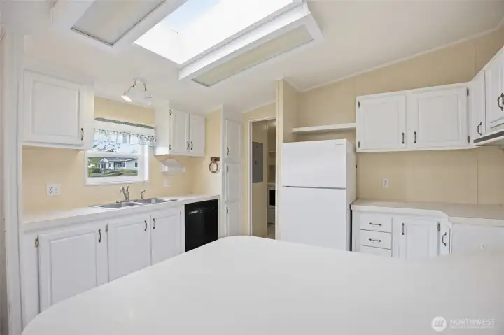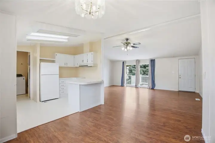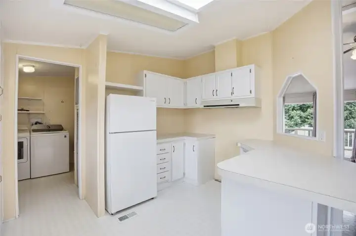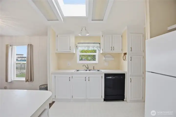 55+ community. 3-bedroom, 2-bath home offering 1,126 sq. ft. of comfortable living space. Exterior features include a covered front porch, covered back deck, fenced yard, gravel driveway, mature landscaping, open lawn area, and storage shed. The property also offers great outdoor space for relaxing, gardening, or entertaining. Inside, the home features an open living, dining, and kitchen layout with abundant natural light and easy flow throughout. The kitchen includes white cabinetry, ample counter space, skylights, and an adjacent dining area. Spacious living areas feature durable flooring, while the bedrooms offer comfortable layouts and good closet space. The primary suite includes a private bath and walk-in closet. A separate laundry room adds convenience and functionality. Park Approval required.