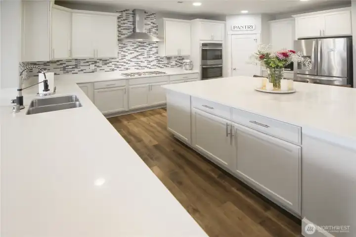 The STUNNING kitchen is loaded with upgrades, including an beautifully oversized quartz island.