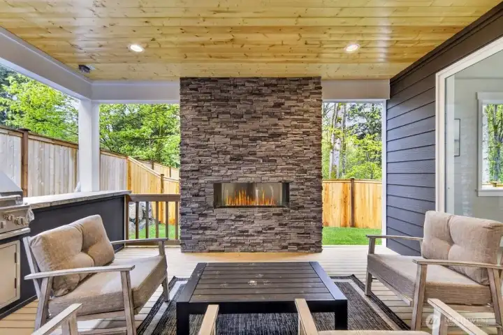 Incredible covered deck with built-in BBQ and outdoor fireplace