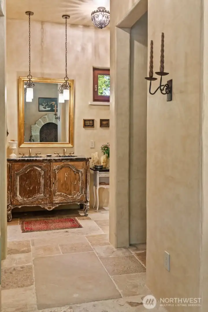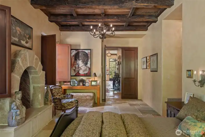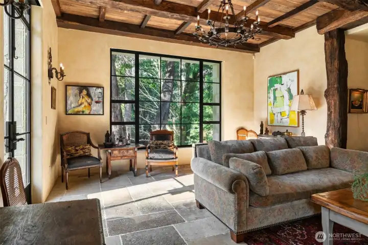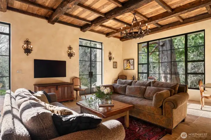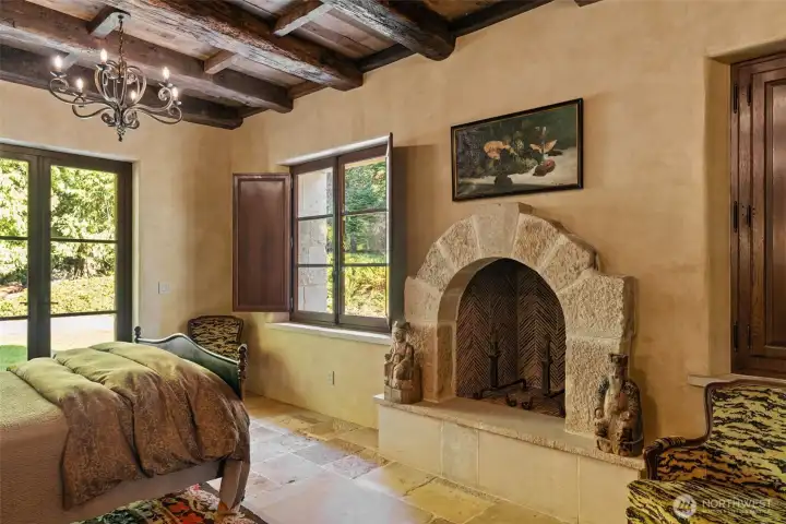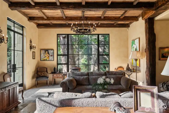 A refined gathering space where historic materials and modern comfort coexist seamlessly. A striking fireplace crafted from reclaimed French limestone anchors the room.
