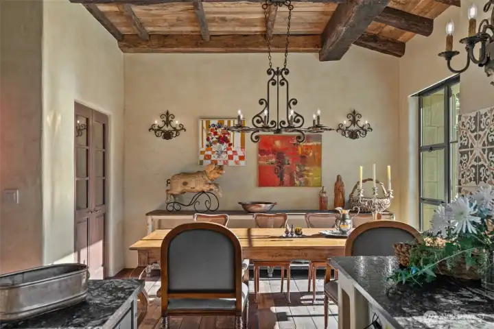 Dining room framed by hand-finished plaster walls and reclaimed architectural elements.