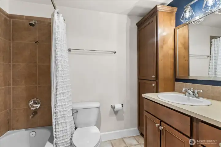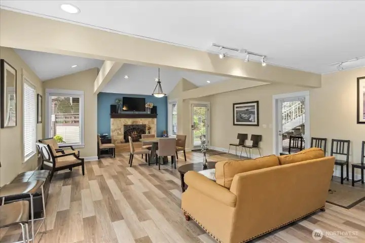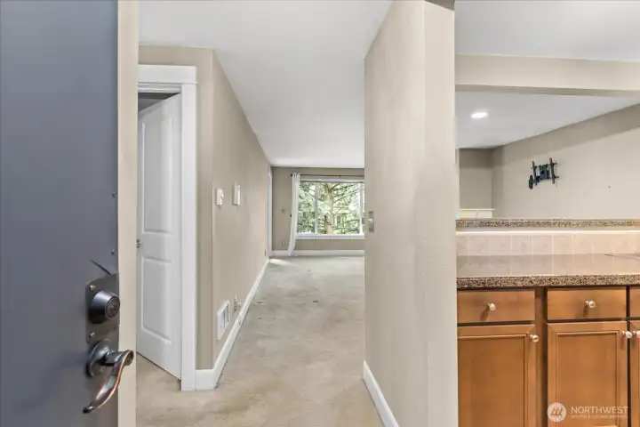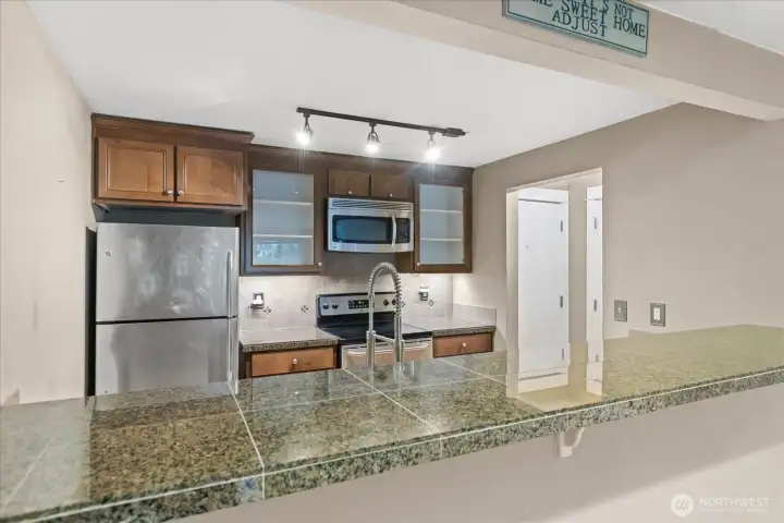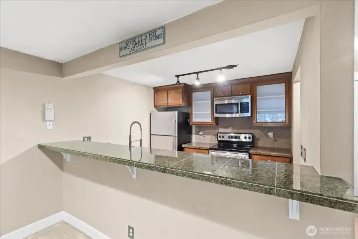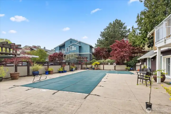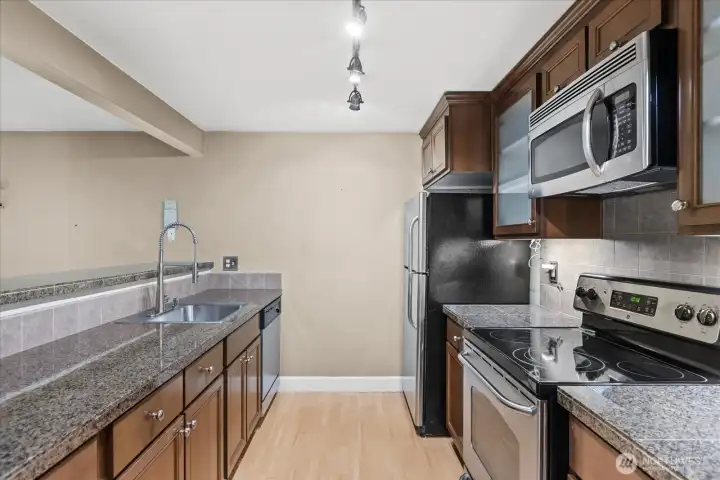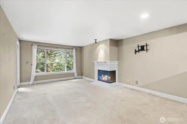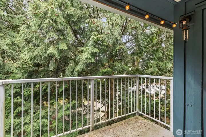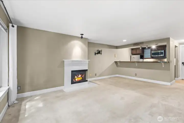 Set in the city, but tucked away in nature, the Cove at Veridian is a nearly 5 acre community of landscaped walking trails, gardens, and dedicated pet areas. This top floor corner unit is tucked away, offering incredible privacy and convenience that is rarely found in Seattle. The floor plan lives large, the open living room has a wood burning fireplace, and the kitchen has eating space at the bar and plenty of room for a separate dining space. The deck and primary bedroom are hidden in complete privacy by the tree canopy. Residents enjoy a modern clubhouse, indoor hot tub, heated outdoor pool, fitness center, yoga studio, and private access to Bitter Lake Park. Secure parking garage with the best assigned parking space available (surrounded by walls!) and plenty of guest parking. No Rental Cap, amazing community, on-site manager, bus line, and future Light Rail opening near by make this a perfect spot for just about anyone! HOA covers water, sewer, garbage, and is managed well. Don't miss the opportunity to make this place your own! Virtually staged.