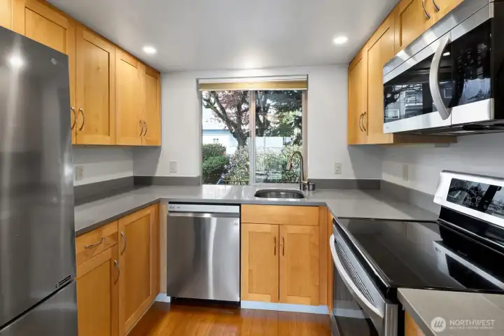 Come home to low-maintenance living overlooking Bellingham Bay! Ground floor unit features partial views of the ocean and islands, along with bamboo floors, newer appliances and newer kitchen countertops. Deck was replaced this summer and the building has a new roof. Unit includes 1 assigned covered parking spot, and a storage unit. Just two blocks away from Bellingham's iconic Taylor Dock and boardwalk, and close to historic Fairhaven!