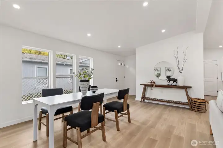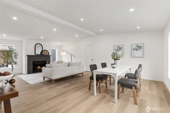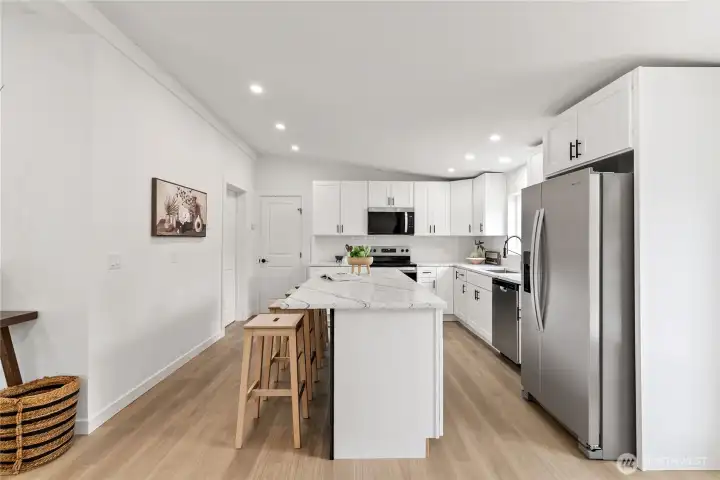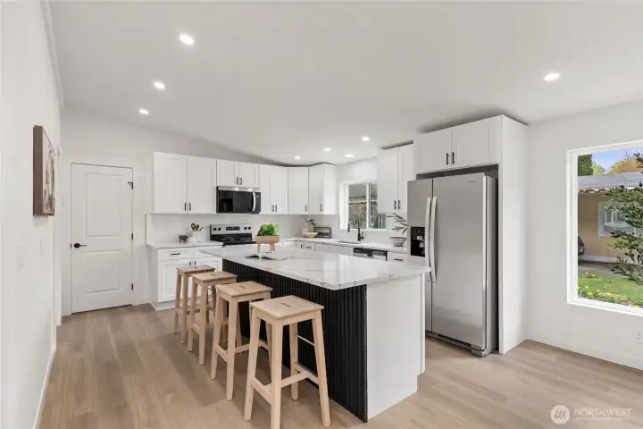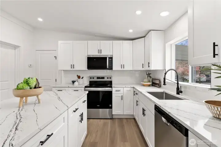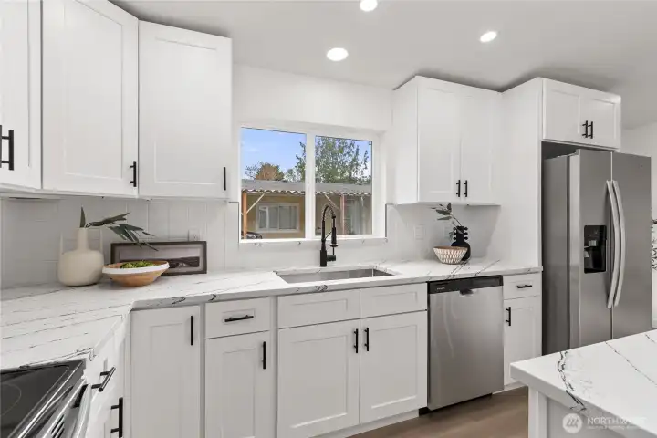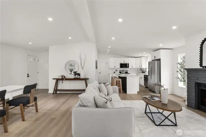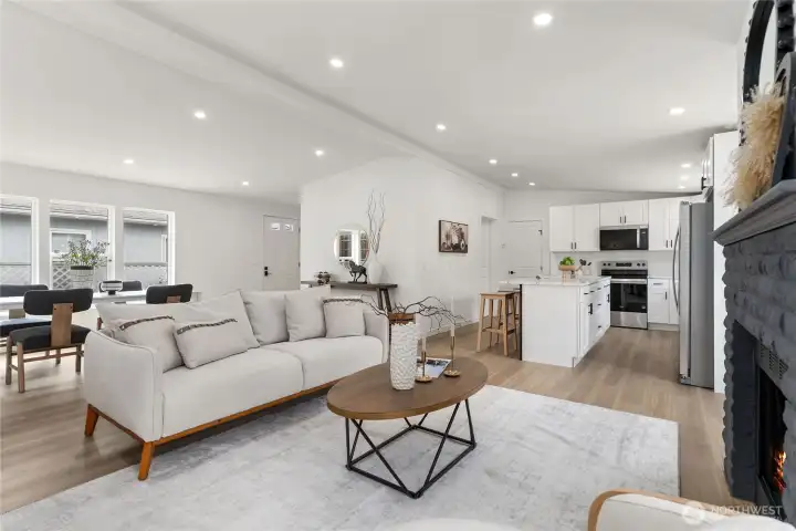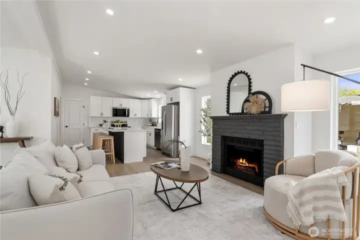 Welcome to the sought-after Sunnydale all-age community, offering fantastic amenities including a pool, clubhouse, basketball court, and playground. This beautifully updated home features 4 bedrooms and 2 bathrooms with an inviting open-concept layout and vaulted ceilings that create a bright and spacious feel throughout. The living room is warm and welcoming with a cozy wood-burning fireplace. The stunning kitchen has been fully updated with stainless steel appliances, quartz countertops, a sleek island, and a custom backsplash—perfect for both everyday living and entertaining. The oversized primary suite offers a walk-in closet and a luxurious ensuite bathroom with custom tile work, double vanity, soaking tub, and separate shower. Three additional generously sized bedrooms and a stylish guest bathroom provide plenty of space. New Roof. Convenient laundry room includes a new water heater. Outside, enjoy a covered awning and extra storage with a shed. Ideally located close to shopping, dining, and major freeways, this home combines comfort, style, and convenience. Must see!