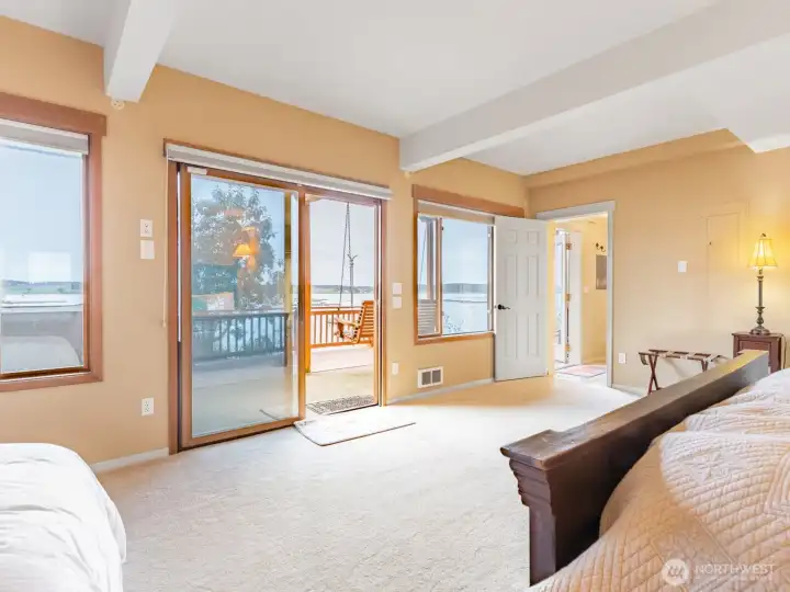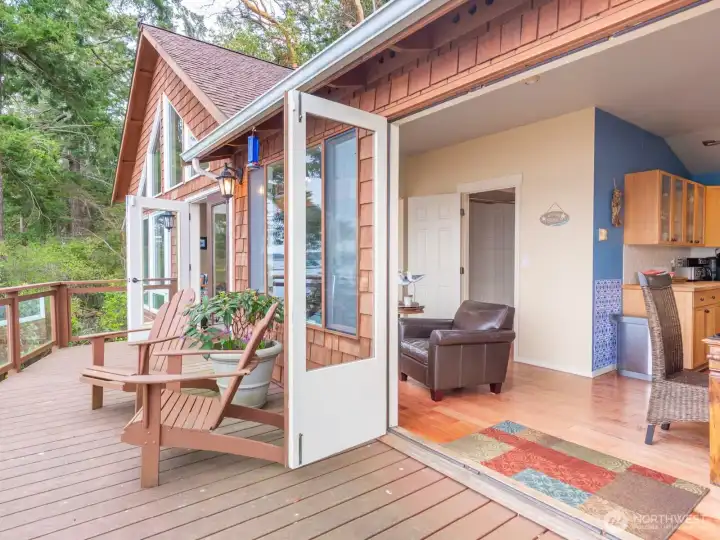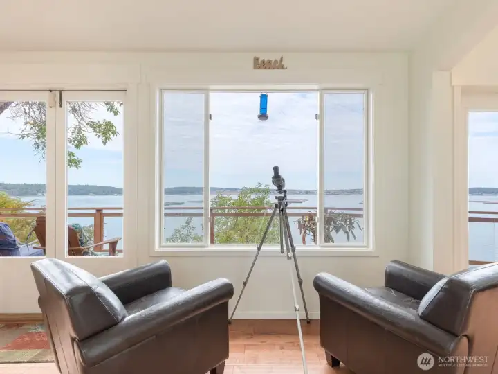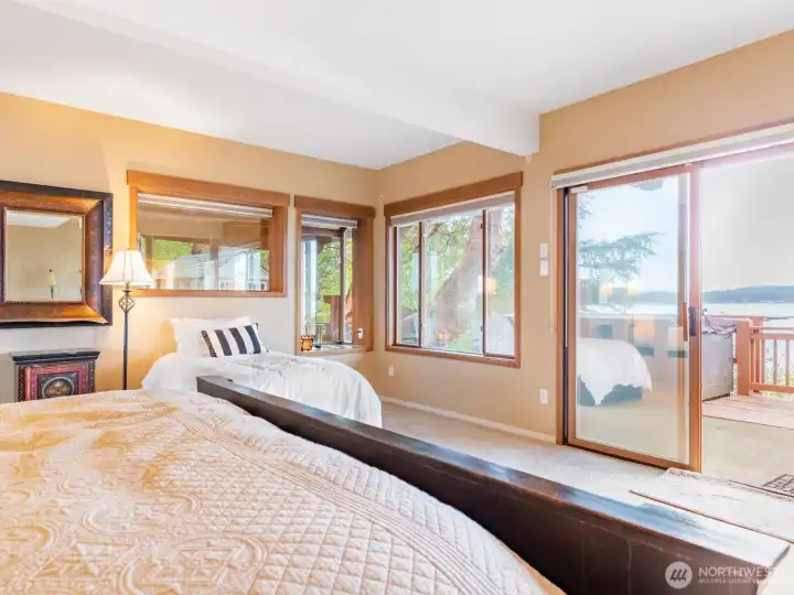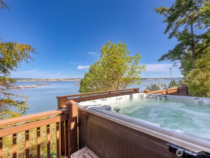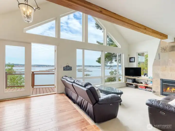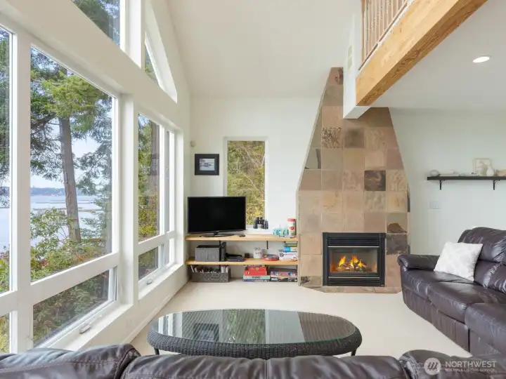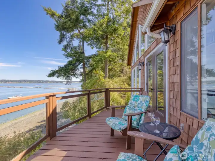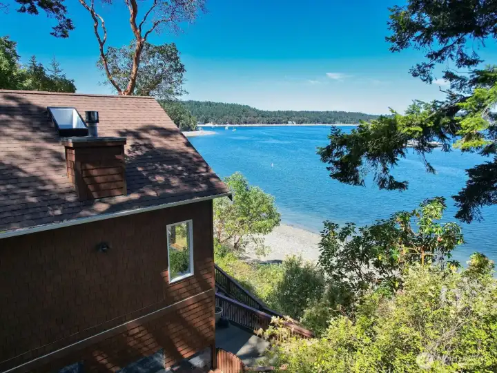 Perched on a serene, private stretch of Whidbey Island shoreline, this captivating waterfront retreat offers the perfect blend of Northwest charm, breathtaking views, and everyday comfort. Set on an expansive 27,007± SF sloping, wooded lot with an impressive 335 feet of waterfront and protective bulkhead, this property delivers a rare sense of seclusion while remaining conveniently accessible. The 1,818± SF home is thoughtfully designed to maximize its stunning surroundings. Inside, the vaulted, beamed great room welcomes you with a warm gas fireplace and walls of windows that frame sweeping views of the water, sunsets, mountains, and abundant wildlife. Whether you’re entertaining or enjoying a quiet evening, the ever-changing scenery becomes the centerpiece of daily living. The stylish kitchen features stainless steel appliances, an island with bar seating, and seamless flow into the spacious dining area—both perfectly positioned to take in the view. A charming sleeping loft offers additional guest space or a cozy retreat, also sharing in the home’s incredible vantage point. Wake up to water views in the generous primary suite, complete with its own bath and private deck access—ideal for morning coffee or evening unwinding. A guest bedroom provides comfortable accommodations for visitors. Outdoor living is equally inviting, with expansive view decks on both levels and a lower deck featuring a hot tub for soaking under the stars. The bulkhead shoreline offers easy access