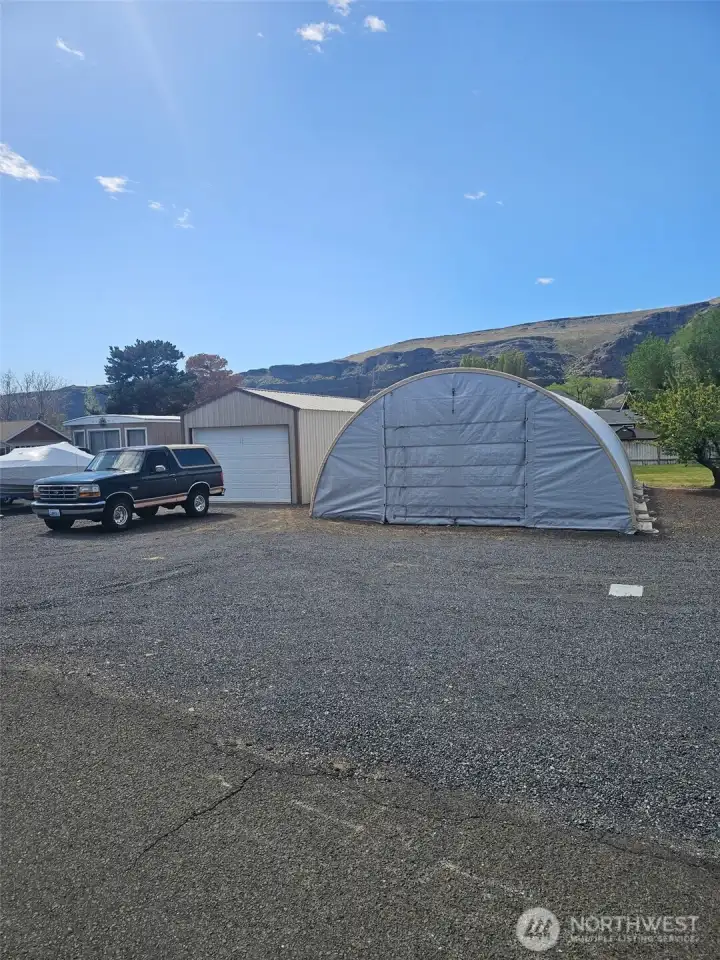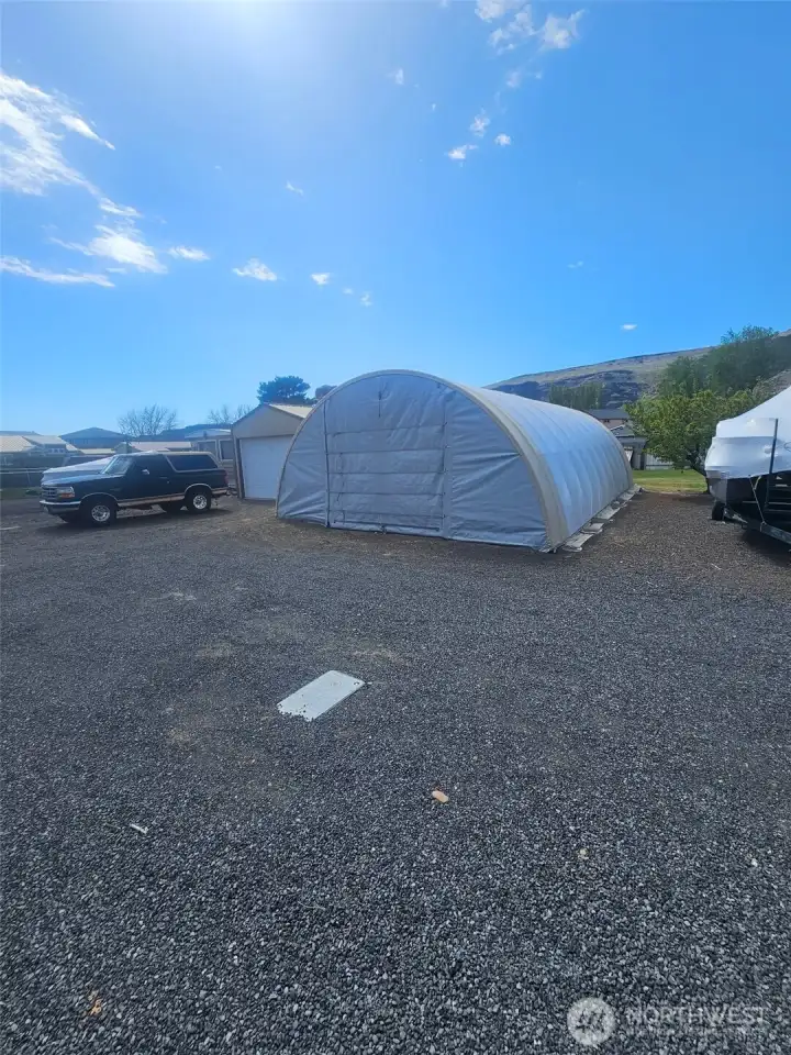 Nice level lot with existing garage as well as "HOOP" shed large enough for Pontoon boat toys etc. Septic installed, nice lawn and sprinkler system, ready to build or use as-is.
