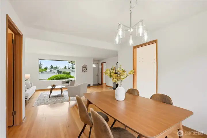 Open concept living room & dining room with lovely original hardwood floors, wood burning fireplace, original mid-century doors and trim and a fresh paint job!