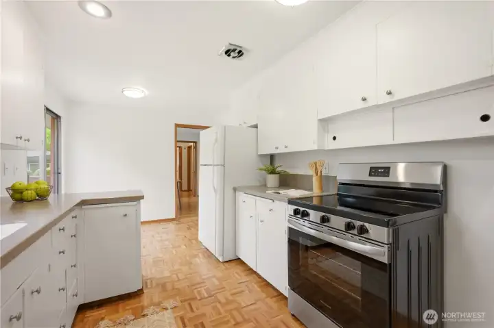 The well appointed kitchen has freshly painted cabinets and a new stove. Perfectly fine "as-is" or renovate to create your dreak kitchen.