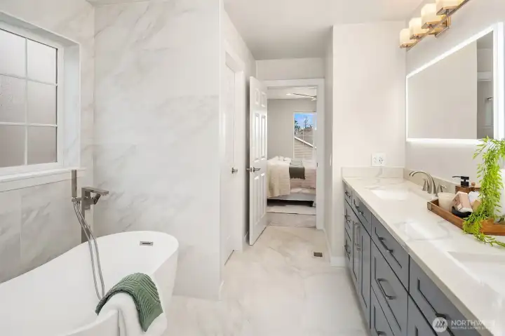 Fully remodeled primary bath with quartz slab, new fixtures, soaking tub, toilet and updated flooring.