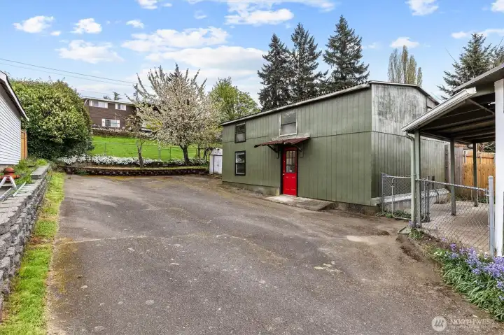 Opportunity in South Tacoma! This 3-bedroom, 2-bath home offers strong value-add potential with a partially finished detached dwelling unit, ideal for rental income or multigenerational living. Freshly painted siding enhances curb appeal, while mature fruit trees add charm and usability to the outdoor space. Large drive way offers plenty of parking and even room for an RV. Conveniently located near Fern Hill with easy access to I-5, downtown Tacoma, Pacific Lutheran University, and Joint Base Lewis-McChord. Buyer to verify all information.