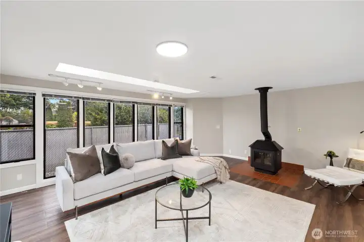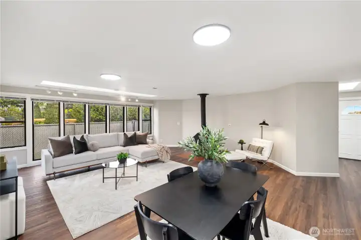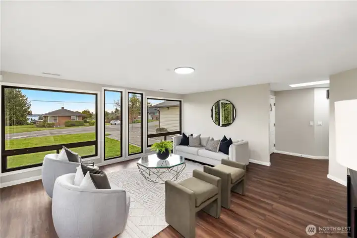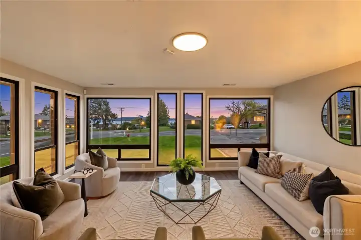 Large Front Windows Showcasing Views of the Sound and Olympics