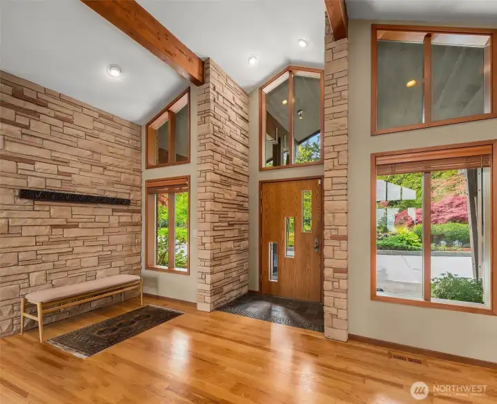 Beyond the front door, a sculptural entry hall introduces the home with a refined blend of stone, light and Northwest-inspired architecture.