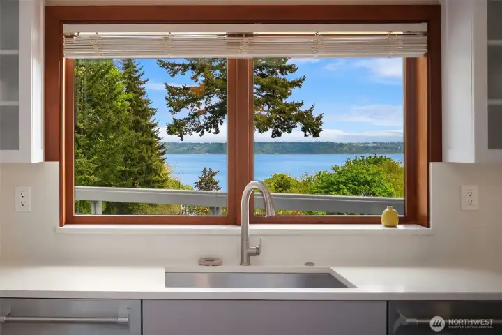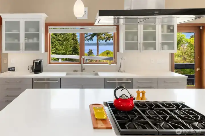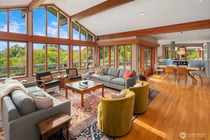 Vaulted wall of glass frame the view of Puget Sound views, filling the great room with light and effortless Northwest elegance