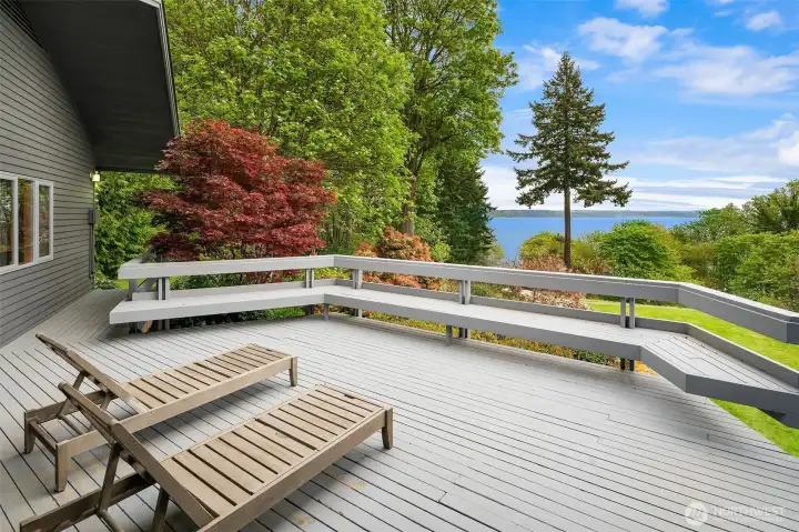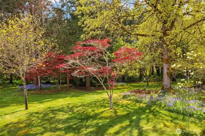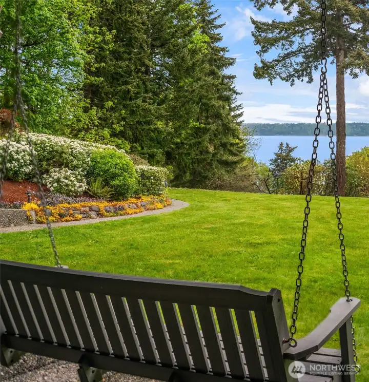 Private garden patio offers a magical setting for al fresco dining overlooking verdant gardens and Puget Sound views.