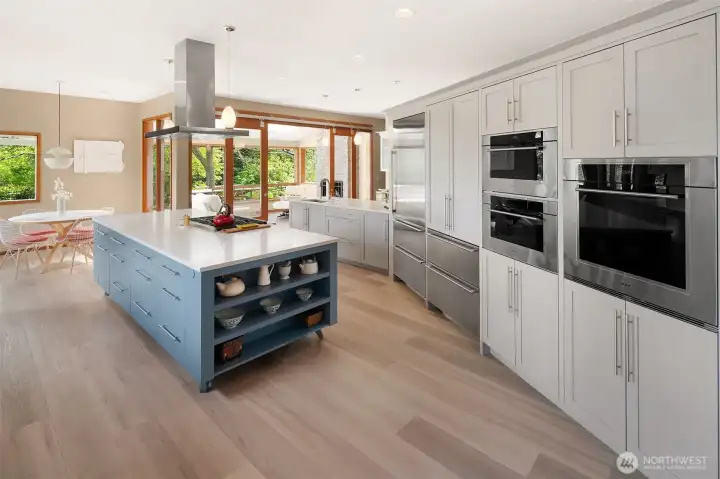 A true culinary centerpiece featuring Sub-Zero refrigeration, six-burner Wolf range, dual Fisher & Paykel dishwashers and wine storage. Double islands create exceptional workspace and casual seating.