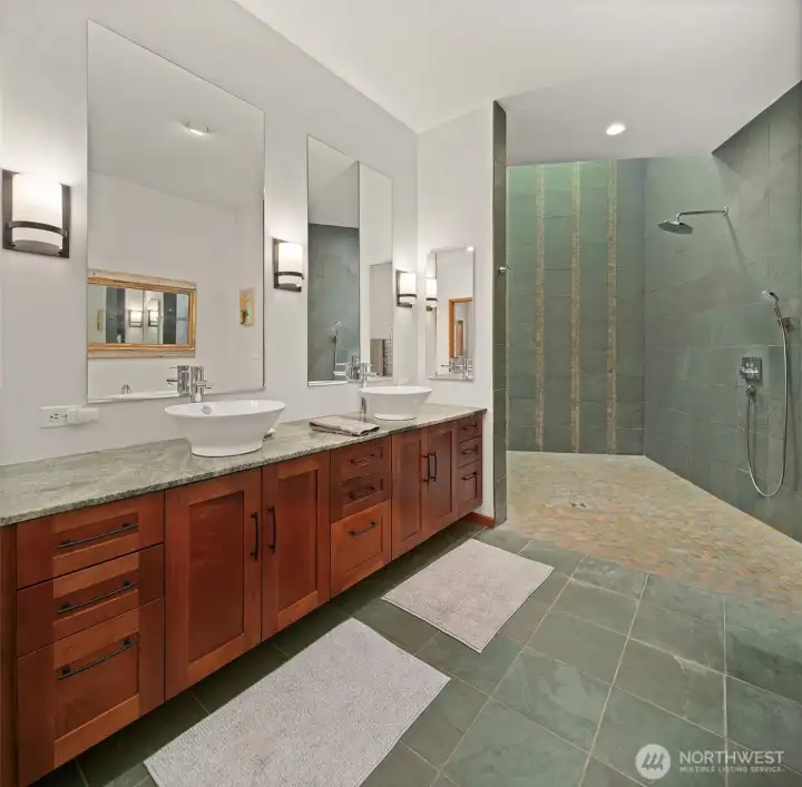 Spa-inspired primary bath with dramatic dual rain shower wrapped in artisan tile and natural light.