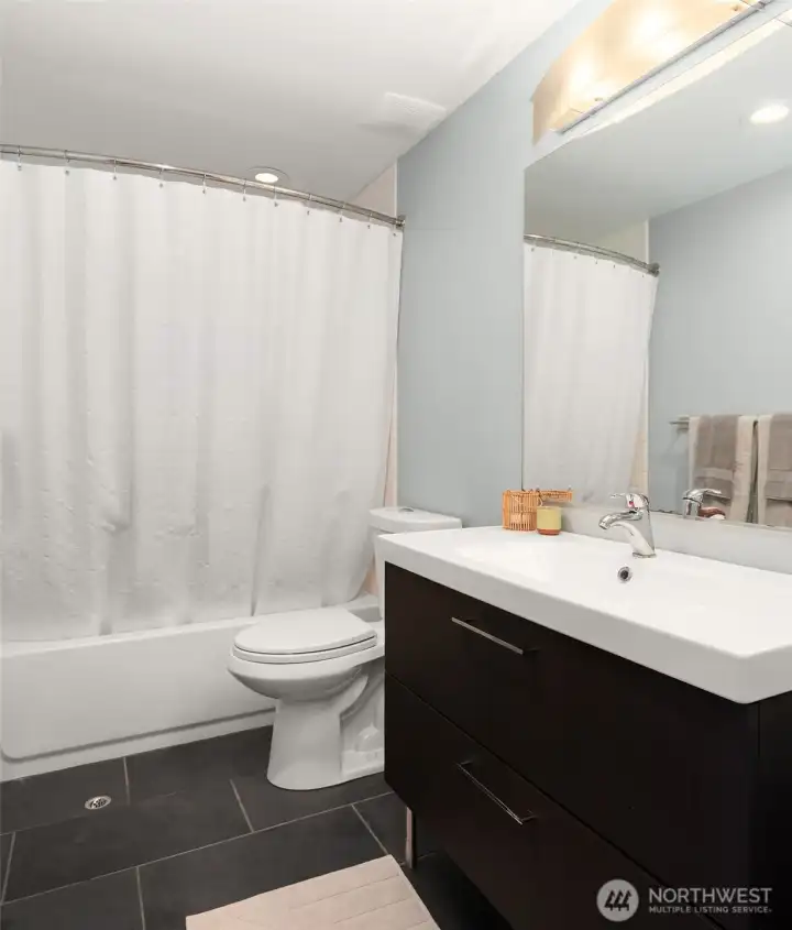Well-appointed private bath serving the second main-level ensuite bedroom.