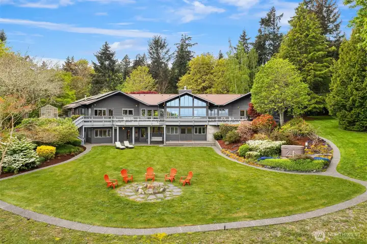Gather around the firepit on the sweeping lawn, where open skies and water views create a magical setting.