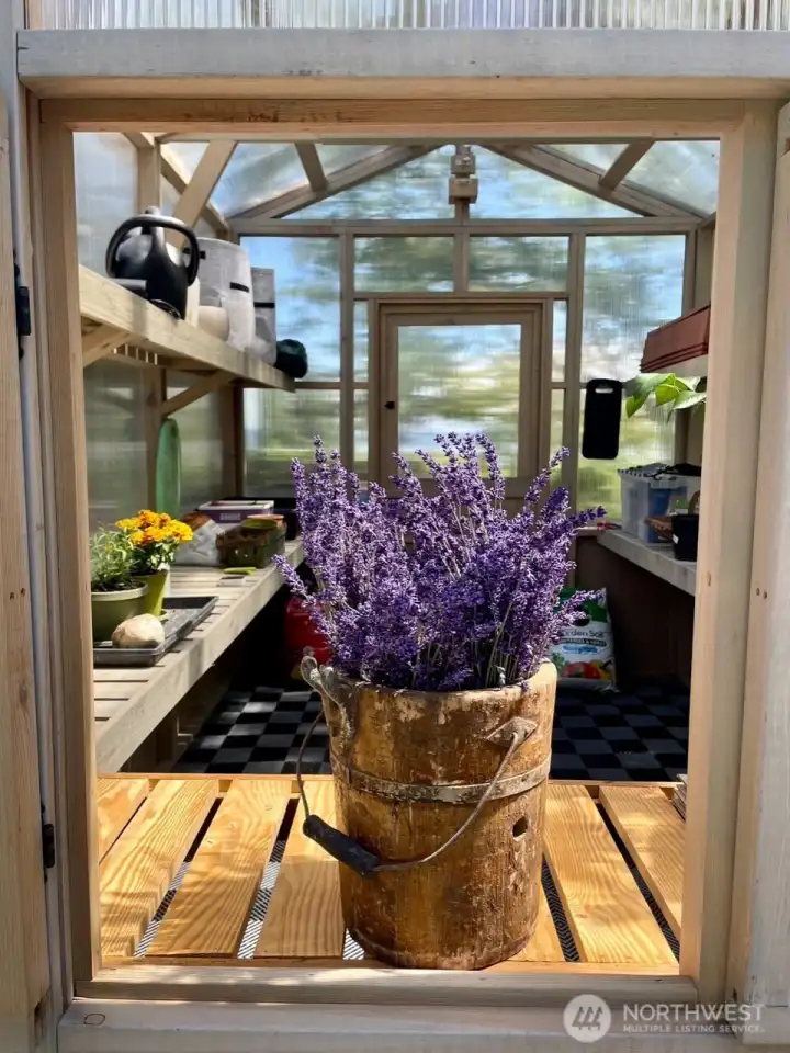 Private garden patio offers a magical setting for al fresco dining overlooking verdant gardens and Puget Sound views.