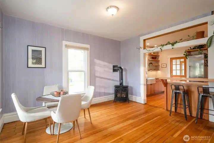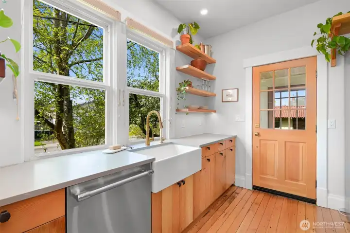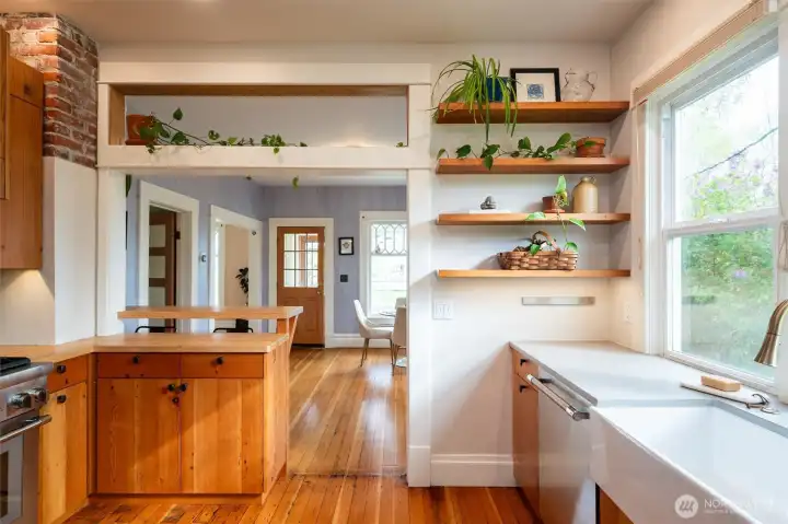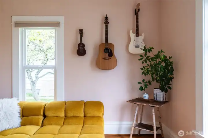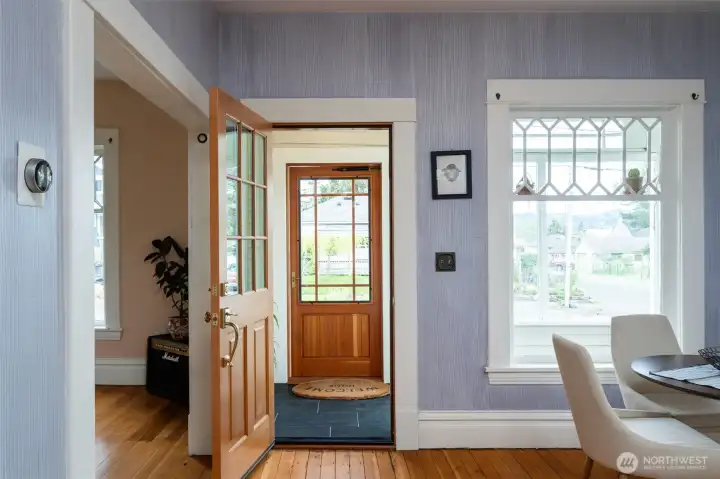 Light and bright living room. Many windows have been updated here, while some original windows have been thoughtfully preserved.