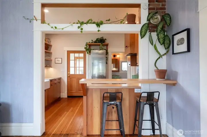 Kitchen remodel features custom cabinets from Carpenter Ant, using reclaimed wood from a barn in Custer.