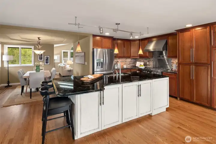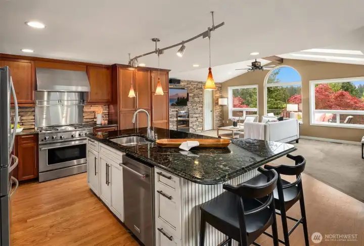 Gourmet kitchen with a huge Italian granite island and bar seating.