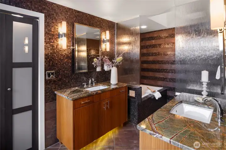 Every day is spa day with this tiled 5-piece bathroom featuring a jetted soaking tub, waterfall shower, sconce lighting, and radiant heated floors.