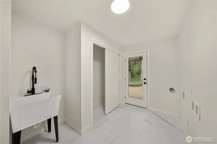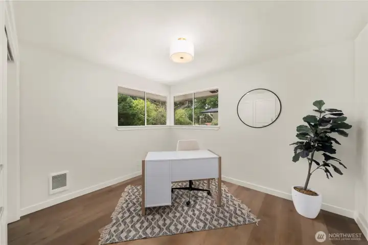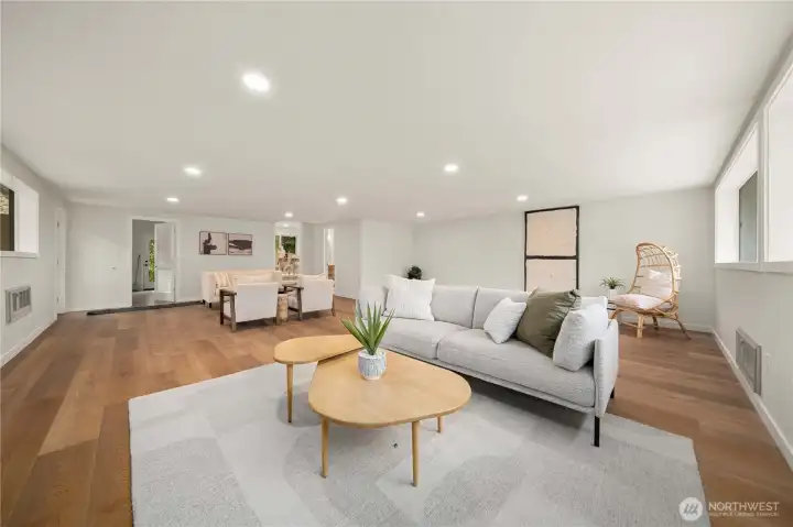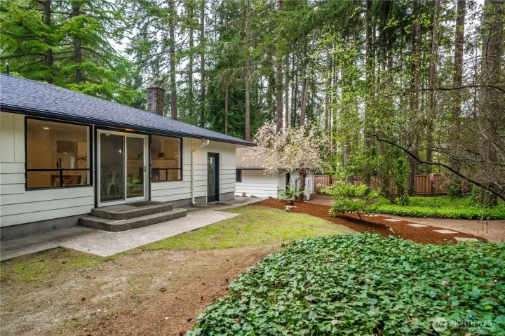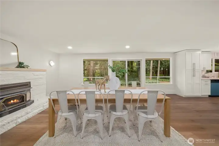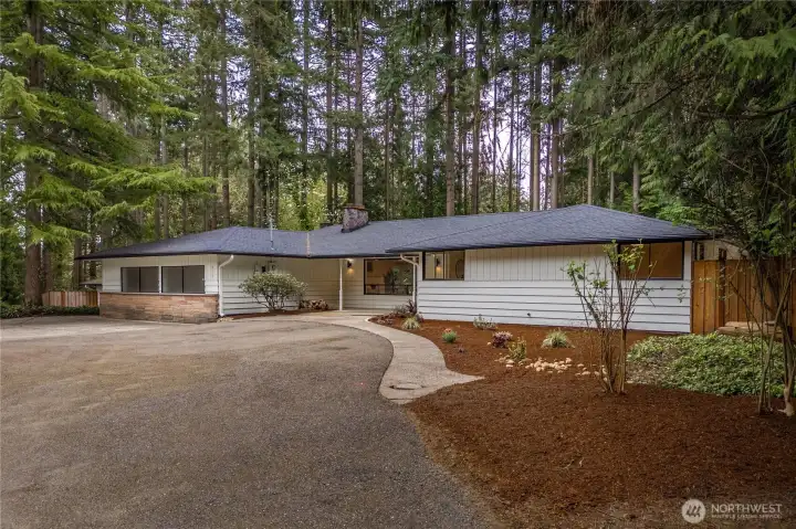 Fully renovated rambler nestled in a peaceful, wooded setting. This home features a new roof, gutters, fresh interior & exterior paint & high-end upgrades throughout. Step into the formal living room showcasing a stunning brick-surround fireplace & expansive windows that fill the space with natural light. The open-concept layout offers seamless sight lines into the spacious kitchen, complete with a center island with additional storage, new stainless steel appliances & a beautiful tile backsplash. The formal dining room features a second fireplace & a sliding glass door leading to the back patio—perfect for indoor-outdoor entertaining. Just steps down from the dining area, a generous family room provides versatile additional living space. The utility/mudroom includes a sink, closet for extra storage & direct access to the backyard. Bedrooms feature original built-ins, adding charm & functional storage. The primary suite offers a spa-like en-suite bath with a large vanity and an oversized walk-in shower adorned with elegant tile work. Outside, enjoy a park-like backyard with mature trees, manicured landscaping, a picnic area, and a concrete pathway leading to the detached two-car garage, which provides ample parking and storage. Situated on just over half an acre, this secluded property offers a tranquil, forest-like atmosphere while remaining just minutes from local amenities and freeway access. Potential opportunity to purchase the adjacent lot for added space or investment.