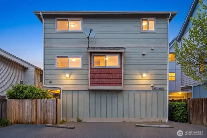 Spacious and flexible end-unit townhome in the heart of Greenwood that meets modern living. Tucked within a 3-unit community with no HOA, this home offers a perfect blend of privacy and convenience. The corner position brings in exceptional natural light through large windows while maintaining a quiet, protected feel. A wider-than-typical layout, tall ceilings, and open spaces create an airy, comfortable flow you don’t often find in Seattle townhomes. The entry level includes a flex bedroom / office and full bath with its own secure back entrance—ideal for guests, work-from-home, or rental potential. Off the entry level bed you'll find a unique oversized yard with code-equipped access that adds usable outdoor space without sacrificing privacy. The second level is dialed—featuring hardwood floors throughout the open concept living, kitchen, and dining spaces, plus a well-placed powder room off the living area. The kitchen has a gas range, ample cabinetry, bar seating, and great prep space for daily living or hosting. On the 3rd and final level, you'll find the primary suite with a double vanity en-suite and strong natural light between the mature landscaping shading the Juliet balcony. Fresh interior paint and new carpet make it truly move-in ready. Dedicated off-street parking provides everyday convenience. Steps to transit and minutes to the Lightrail. Simple commute to DT, the Eastside, and all things Seattle has to offer. Don't miss it!