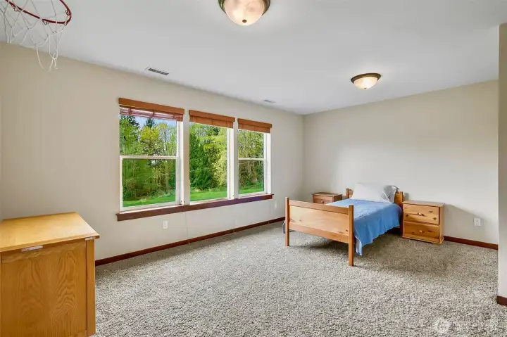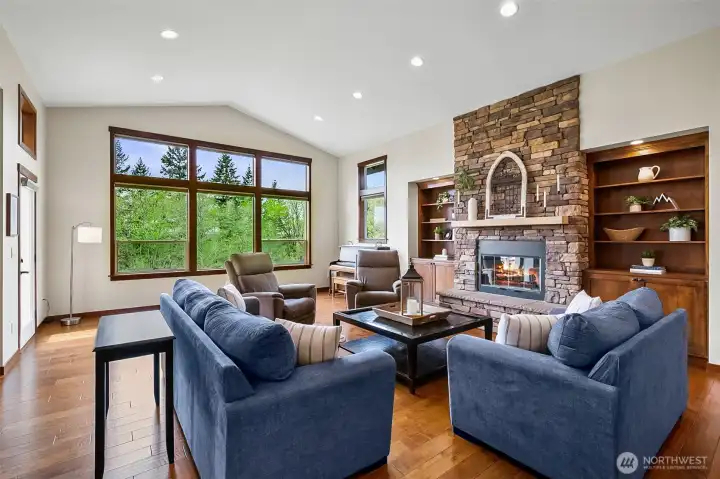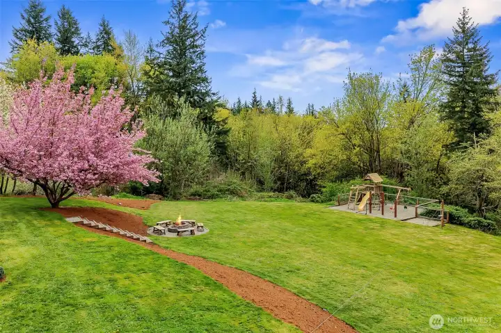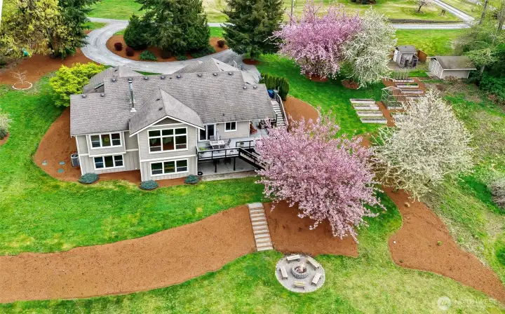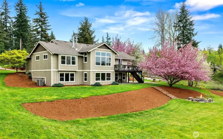 This stunning custom built 3,555 sq ft home set on 5 park-like acres surrounded by mature trees. The property offers a serene, private setting complete with a charming fire pit area, ample seating, and multiple garden beds ready for your personal touch. Inside, you’ll find spacious bedrooms designed for relaxation and flexibility, along with a welcoming great room featuring a cozy fireplace and elegant built-in shelving that creates a warm, inviting focal point. Expansive windows are thoughtfully placed throughout the home, filling each space with natural light and offering picturesque views of the lush acreage in every season. The open-concept kitchen is ideal for both everyday living and entertaining, boasting stainless steel appliances, gas stove, and generous workspace. Retreat to the luxurious primary suite where the bathroom offers a spa-like experience with a soaking tub, separate tiled shower, and sleek glass doors. A dedicated sauna room adds an extra layer of comfort and wellness to the home. The lower-level basement expands your living space with a versatile rec room perfect for gatherings, hobbies, or a home theater. Step outside to enjoy seamless indoor-outdoor living with a spacious deck and a covered lower patio overlooking the expansive grounds. This exceptional property combines peaceful outdoor living with thoughtfully designed interiors, creating a truly remarkable place to call home, with endless room to explore, garden, and unwind across all five acres.