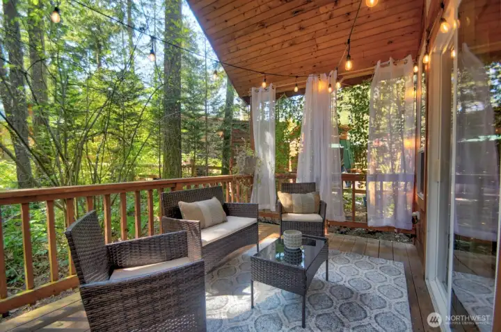LIVING ROOM OPENS ON TO SIDE COVERED PORCH WITH SLIDING GLASS DOORS.