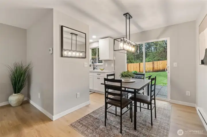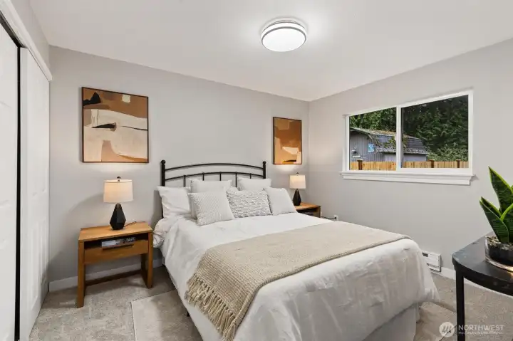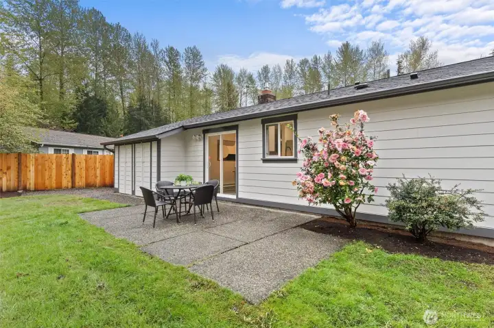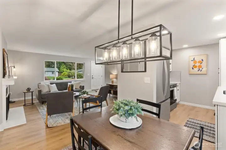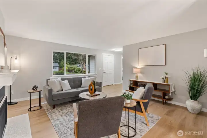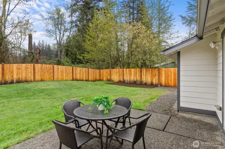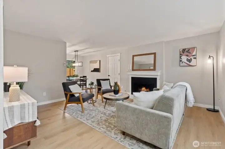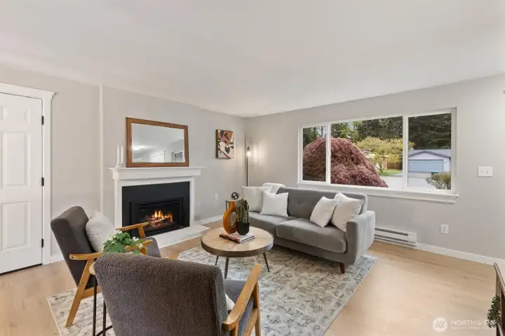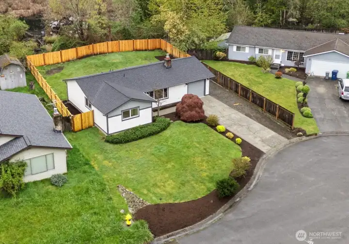 Stylishly updated rambler in the desirable Mays Pond community! This move-in-ready home is tucked on a quiet cul-de-sac and features a spacious, private backyard backing to Mill Creek Community Association open space, offering a peaceful, park-like setting with trees and walking trails beyond. The updated kitchen includes brand-new appliances, new cabinetry, quartz countertops, and tile backsplash. Additional improvements include new luxury vinyl plank flooring, carpet, lighting with adjustable color, hardware, baseboards, interior and exterior paint, washer and dryer, a new 6’ cedar fence, and a newer roof (2023). The living room offers a cozy gas fireplace, and the laundry room is conveniently located inside the home. Step outside to the private backyard and patio—perfect for relaxing or entertaining while enjoying the quiet setting and natural surroundings. Ideally located near schools, parks, SWIFT Transit Line, and Mill Creek Town Center with shopping and dining, as well as golf and tennis clubs, aquatic center, Arena Sports, and more. A fantastic opportunity to enjoy a well-updated home in a location that balances everyday convenience with a peaceful, natural backdrop.
