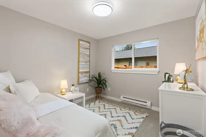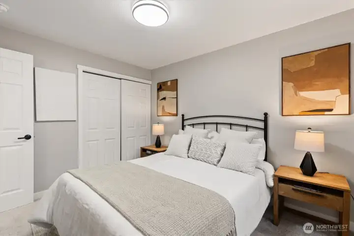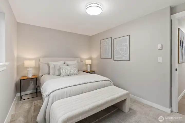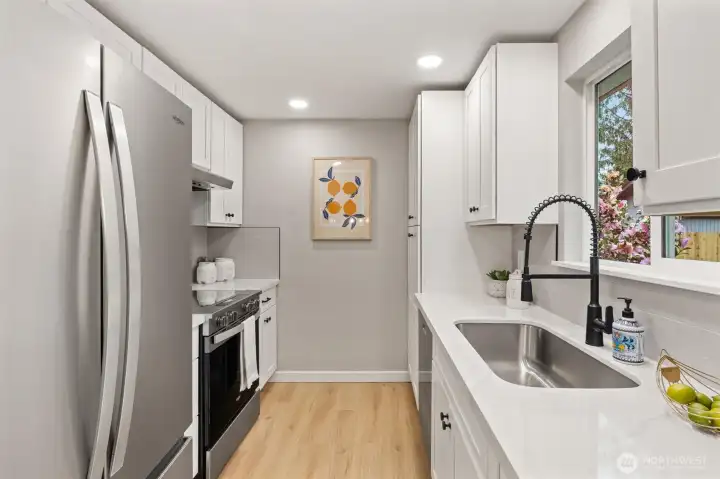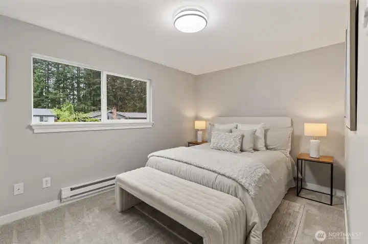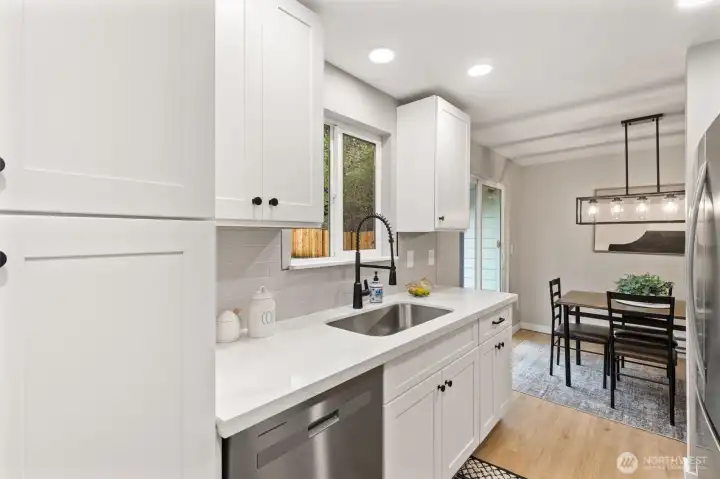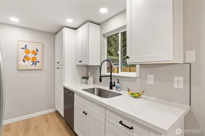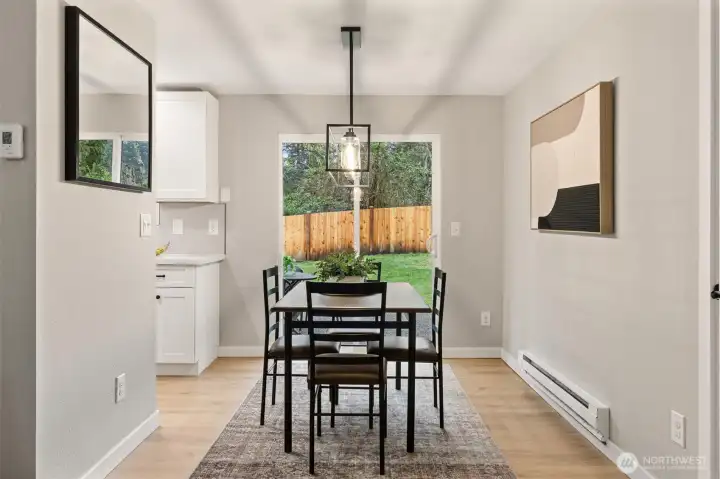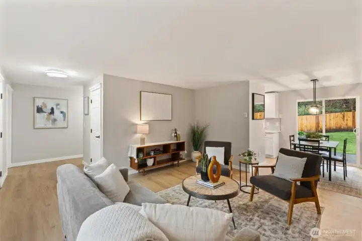 Stylishly updated rambler in the desirable Mays Pond community! This move-in-ready home is tucked on a quiet cul-de-sac and features a spacious, private backyard backing to Mill Creek Community Association open space, offering a peaceful, park-like setting with trees and walking trails beyond. The updated kitchen includes brand-new appliances, new cabinetry, quartz countertops, and tile backsplash. Additional improvements include new luxury vinyl plank flooring, carpet, lighting with adjustable color, hardware, baseboards, interior and exterior paint, washer and dryer, a new 6’ cedar fence, and a newer roof (2023). The living room offers a cozy gas fireplace, and the laundry room is conveniently located inside the home. Step outside to the private backyard and patio—perfect for relaxing or entertaining while enjoying the quiet setting and natural surroundings. Ideally located near schools, parks, SWIFT Transit Line, and Mill Creek Town Center with shopping and dining, as well as golf and tennis clubs, aquatic center, Arena Sports, and more. A fantastic opportunity to enjoy a well-updated home in a location that balances everyday convenience with a peaceful, natural backdrop.