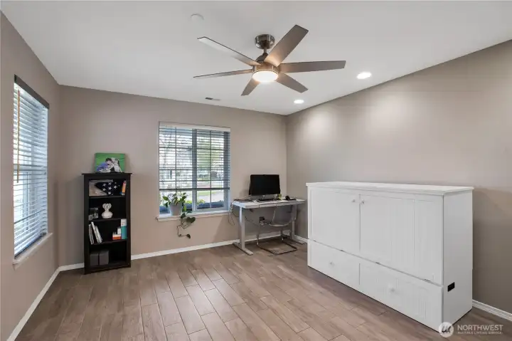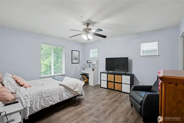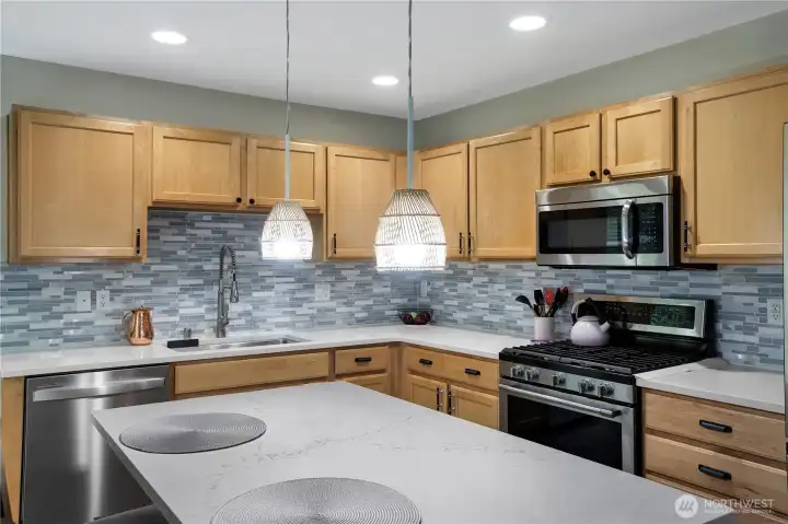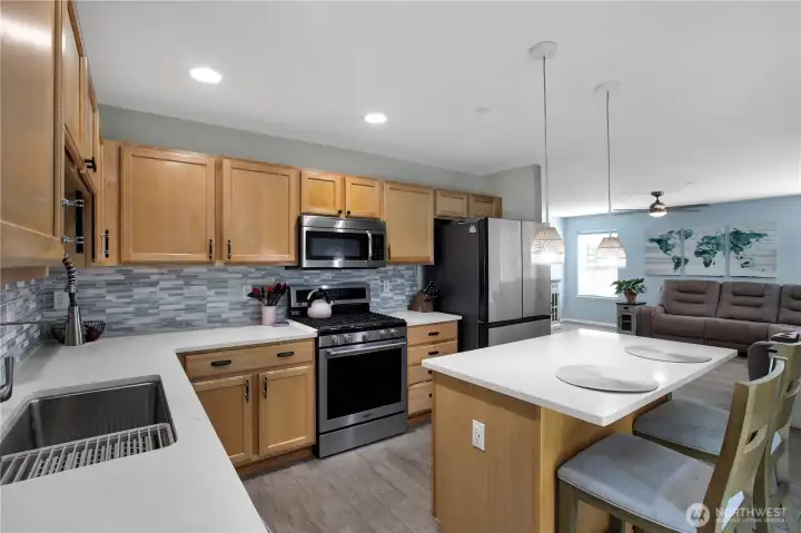 Bright, polished, and move-in ready! The covered front porch welcomes you in, while the private greenbelt backyard creates a peaceful retreat. This 4-bedroom, 2.5-bath home offers 2,603 sqft of thoughtfully designed space, including a front den/office, dining room, and main-level half bath. You’ll find durable ceramic tile throughout and a refreshed kitchen with new countertops, a center island, and walk-in pantry/mudroom. Upstairs, all bedrooms feature ceiling fans and walk-in closets, including a spacious primary suite with a 5-piece bath. Enjoy peace of mind with newer furnace, AC, water heater, and refrigerator, plus smart upgrades like updated lighting, Ecobee thermostat, motion-sensor bathroom lights, and humidity sensors. Complete with a 2-car garage, overhead storage, and trail access from your own backyard. Minutes to JBLM, I-5, and all DuPont has to offer!