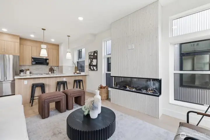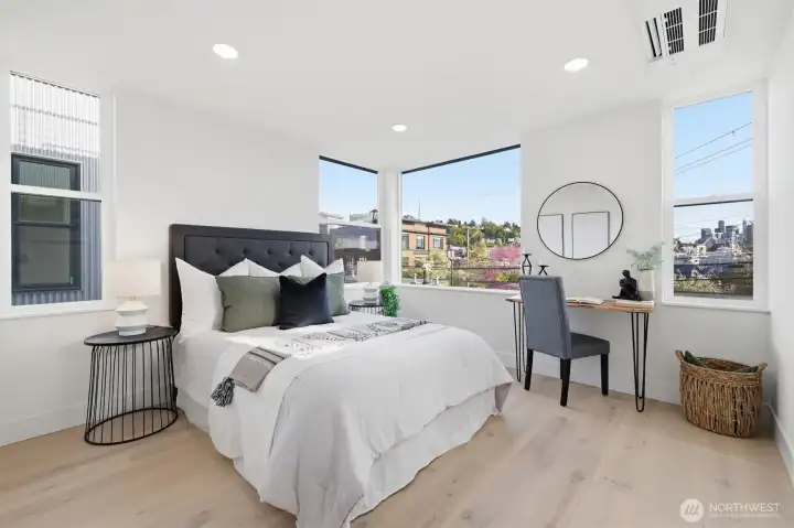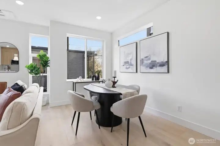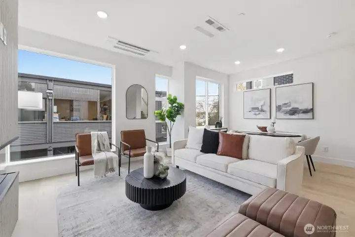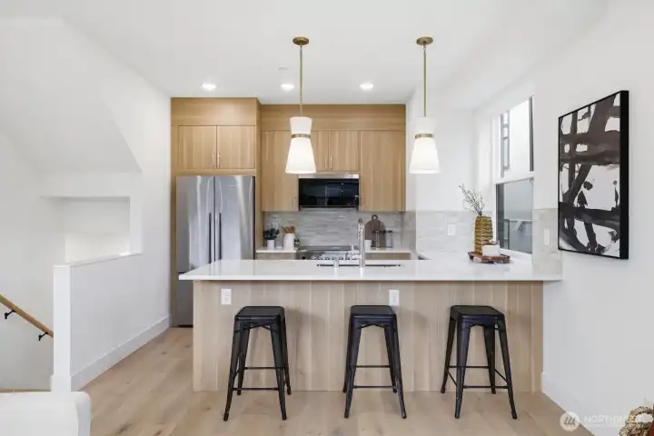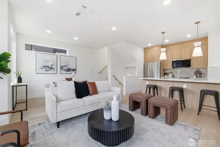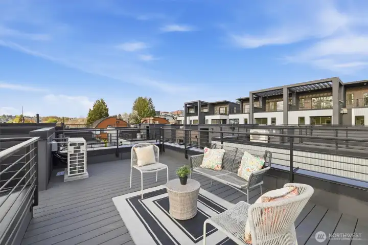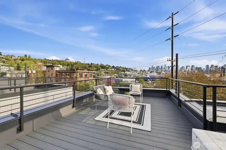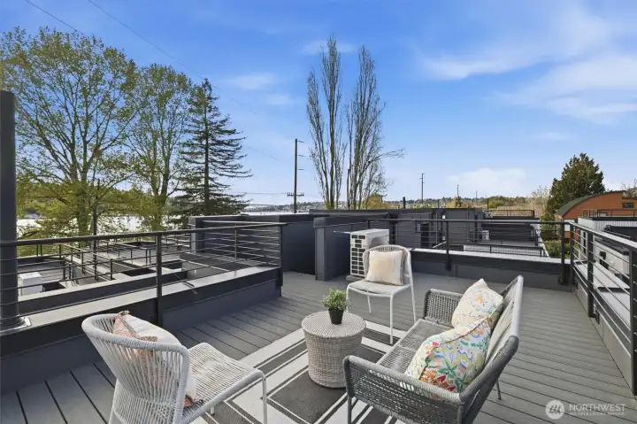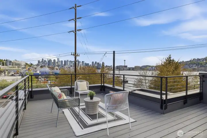 Positioned in the heart of Eastlake, this 2 bed, 2.5 bath residence at Harbor 26 offers 1,307 sqft of well-balanced living with a focus on comfort and function. The open-concept main level connects living, dining, and kitchen spaces seamlessly, finished with clean lines, modern materials, and a thoughtful, livable design. From the living room, take in drop-dead Space Needle views—a striking backdrop that elevates the everyday. Both bedrooms are generously sized, each with its own bath, while a powder room on the main level adds convenience. Above it all, a private rooftop deck extends your living space outdoors, capturing sweeping views of Lake Union and the Seattle skyline. Set within a gated community and complete with secured garage parking, this home offers a more refined, low-maintenance take on waterfront-adjacent living. Crafted by DEP Homes Eastlake, known for consistent quality and intentional design.