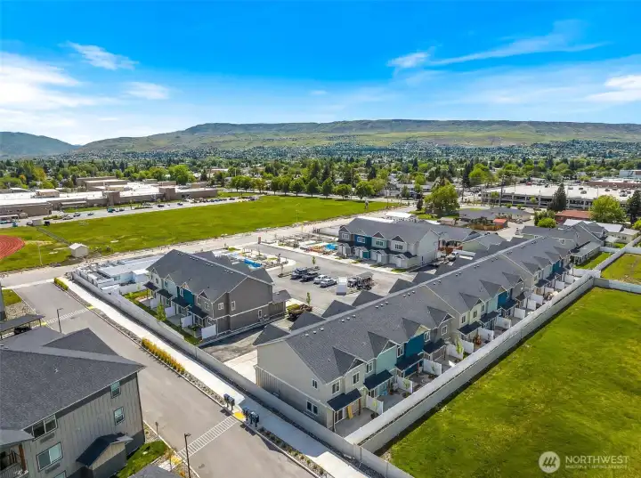 Discover the perfect blend of modern new construction and unbeatable location at Red Apple Townhomes, nestled near the base of scenic Saddle Rock. Just across from Wenatchee High School and down the street from Confluence Health Hospital, this comfortable townhome offers effortless in-town living with stunning natural beauty right at your doorstep. Step inside to find a bright and open great room that flows seamlessly to your private back patio, creating an ideal space for relaxing or entertaining. The light filled modern kitchen shines with sleek white cabinets and quartz countertops, matched by the stylish bathrooms that feature the same high-end finishes. Convenience is built in with an in-townhome laundry closet and your own attached private garage. Retreat to the expansive primary bedroom, complete with a generous walk-in closet and a private en-suite bathroom. Enjoy breathtaking views toward the East Wenatchee Plateau and the iconic Saddle Rock from your new home.The HOA fee of $250 per month takes care of water, sewer, garbage, common area maintenance, and snow plowing to help you enjoy life and worry-free living.