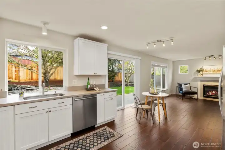 Kitchen has wood-like tiles with radient heat.