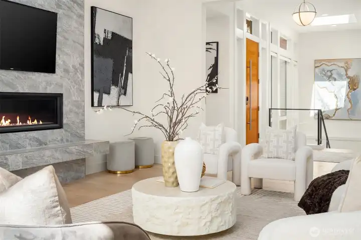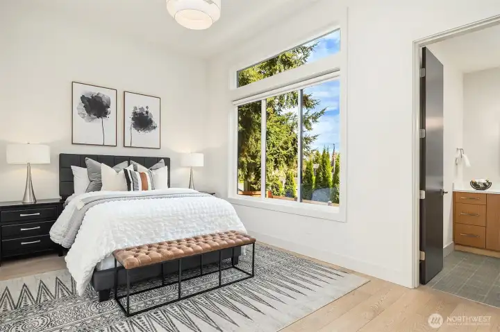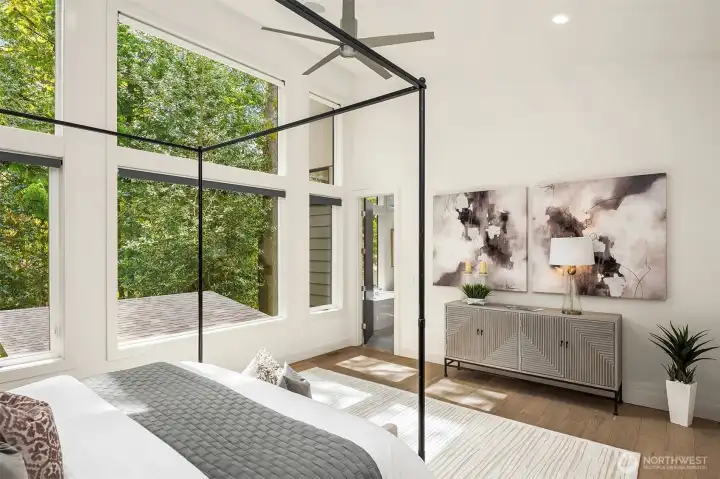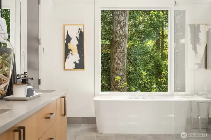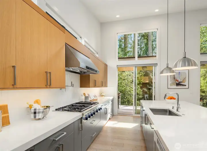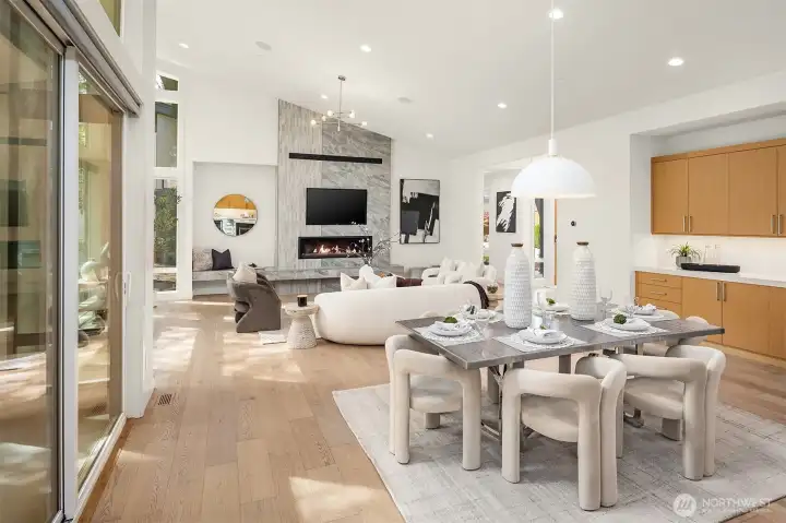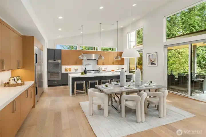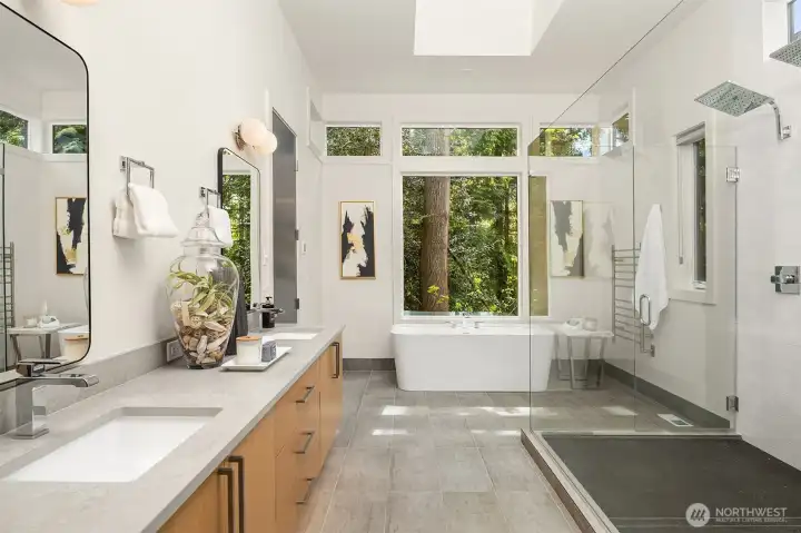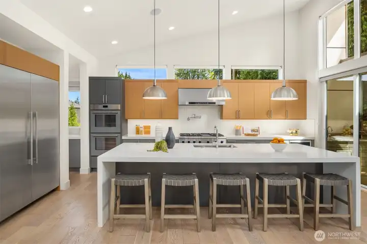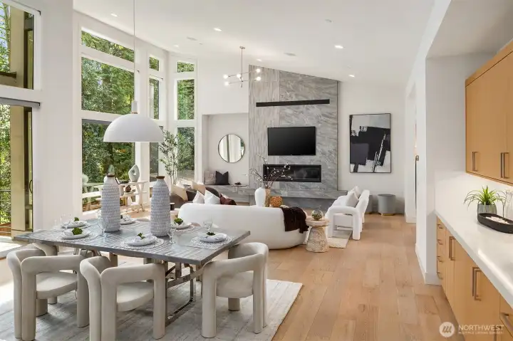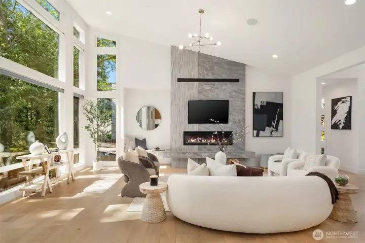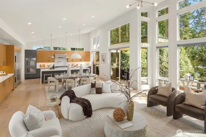 Architecturally stunning, this Kirkland Highlands home was designed around the elements of privacy, space, and tranquility. It's a perfect blend of luxury and comfort. Spectacular ceiling heights and expansive glass walls welcome in the natural light. Designed for entertaining, the kitchen is a chef’s dream, plus an outdoor covered kitchen allows for al fresco dining. Enjoy the versatility of the main level, featuring both a primary and secondary bedroom, complete with luxurious en-suite bathrooms, an office, laundry, and a mud room leading to the finished 3-car garage. The lower level boasts a bonus room, second laundry, and three additional bedrooms with ensuite baths, plus large unfinished space with endless possibilities. The finished garage is perfect for a workshop. Endless storage means you have space for absolutely anything. Don’t miss this rare opportunity to own a truly remarkable property in the heart of Kirkland.