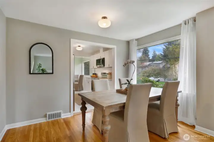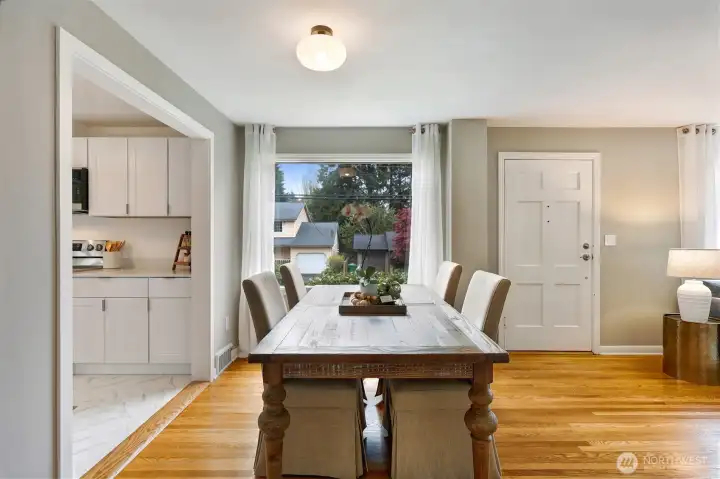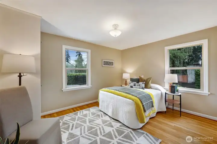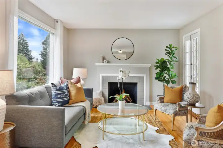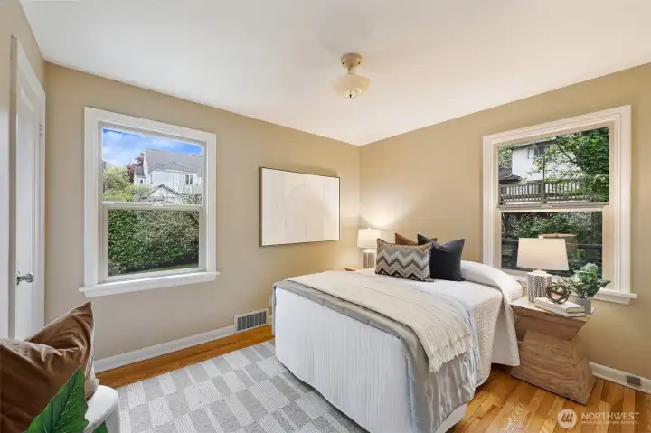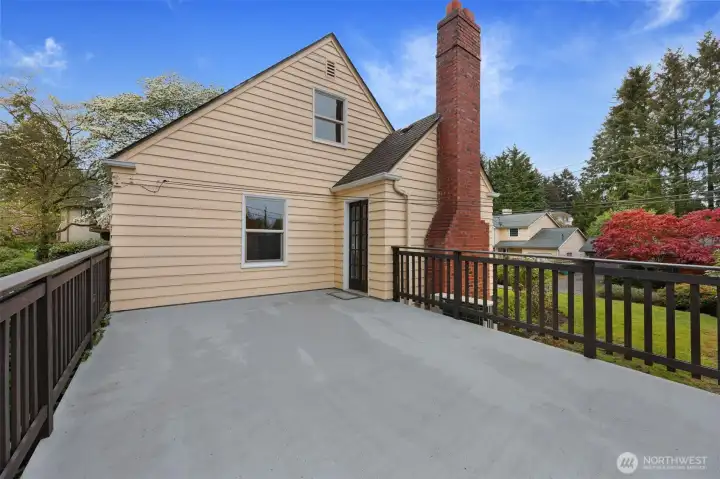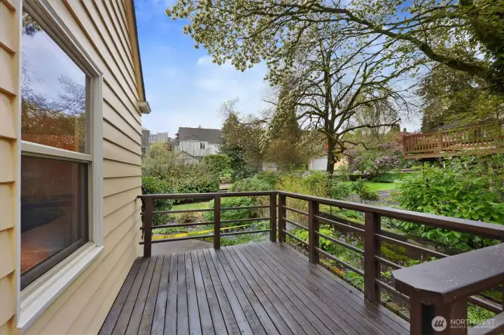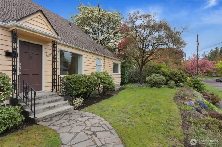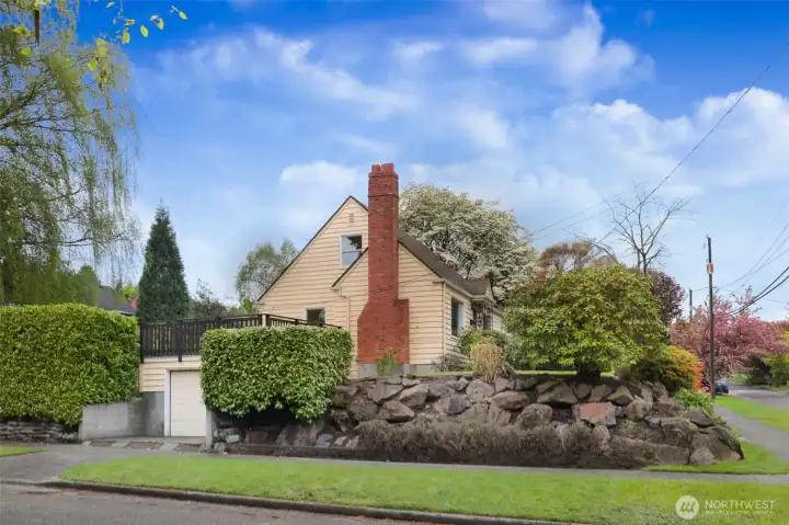 Updated copy per seller requests: Thoughtfully maintained Bryant home situated on a corner lot with elegant, mature landscaping. A gracious living room bathed in natural light and featuring a fireplace and hardwoods welcomes you at the front door. Chefs will love the newly updated kitchen with all new appliances and cabinets. Entertainers will enjoy the dining room adjoining the kitchen and living room, as well as the two outdoor decks for year-round pleasure. The first, accessible right off the kitchen's breakfast nook, offers ample shade for outdoor relaxation. The second is a south-facing rooftop deck off the living room, ideal for enjoying sunny PNW days. Two bedrooms and a full bath are on the main level. Upstairs features a newly updated primary bedroom with an ensuite bath. Lower level flex room, laundry area, non-conforming fourth bedroom, storage space, and a large attached garage. New heat pump HVAC system with central heat and AC. Ideally located on a quiet residential street near popular amenities, including University Village, PCC, Bryant Playground Park, and more. Welcome home!