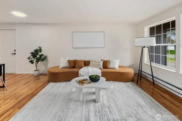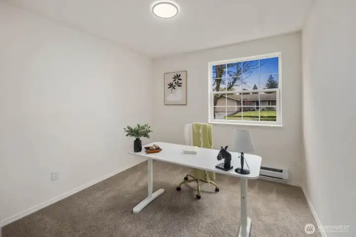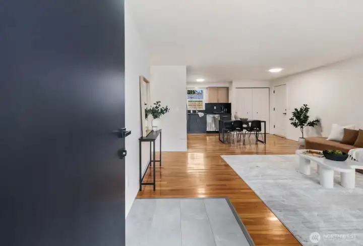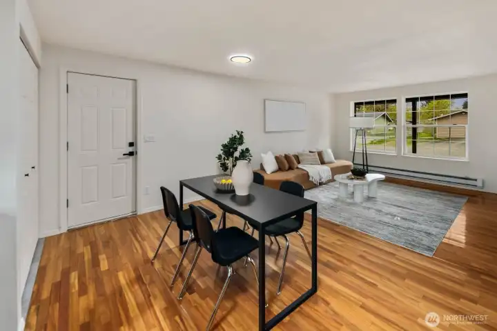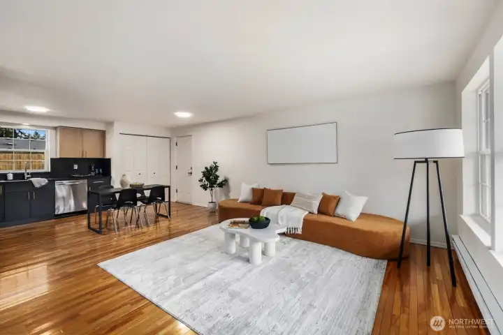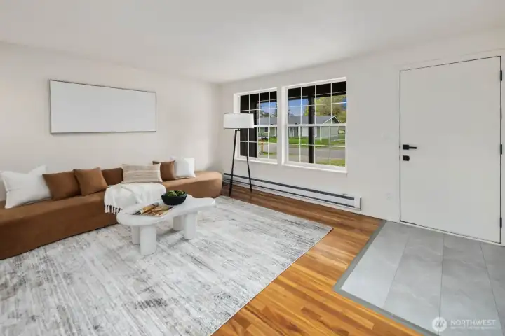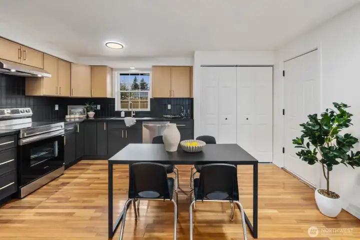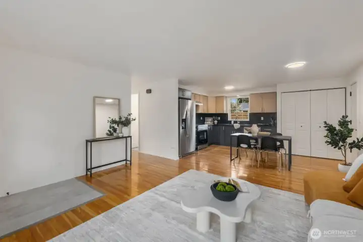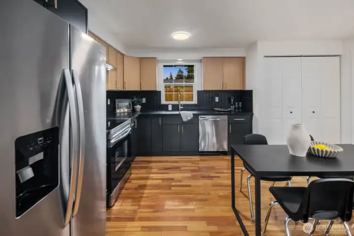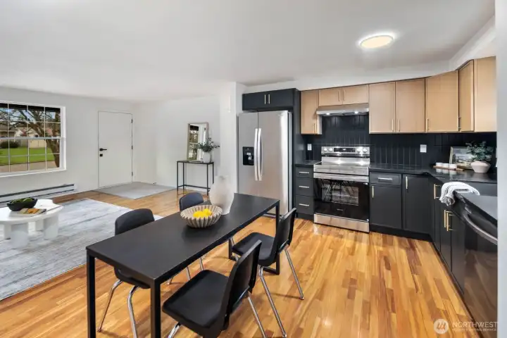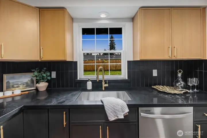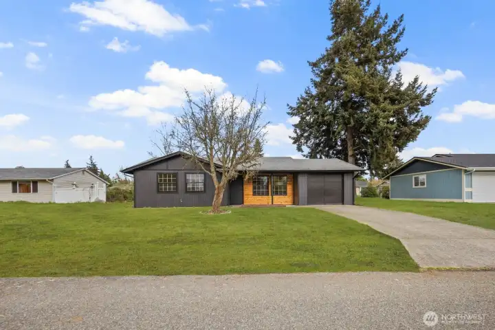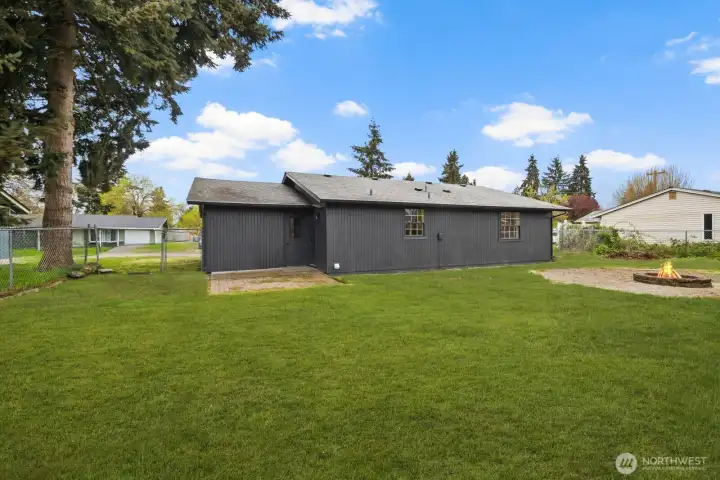 Fully updated and move-in ready, this sharp Spanaway home delivers modern design at an accessible price point. The striking charcoal exterior with warm wood entry detail makes a strong first impression, set on a 7,500 sq ft lot with a spacious yard and a dedicated fire pit area perfect for outdoor entertaining. Inside, the open concept layout flows seamlessly from the living area into a fully renovated kitchen featuring two-tone cabinetry, dark countertops, subway tile backsplash, and stainless appliances. The full bathroom connects directly to the primary bedroom, offering an en suite feel with updated wood-tone vanity, matte black fixtures, and clean white finishes. Three comfortable bedrooms with fresh carpet complete the accommodations. At 1,016 square feet, the layout is efficient and well-executed, with quality finishes throughout that punch well above the price. Easy access to Joint Base Lewis-McChord, shopping, and South Sound commute routes. A turnkey opportunity in Spanaway that shows exceptionally well.