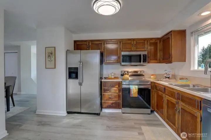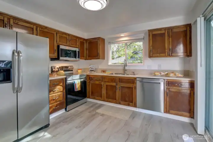 Kitchen sliders lead to big deck for entertaining guests.
