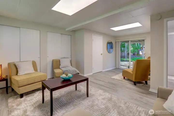Downstairs rec room sliders lead to nice patio area under the deck. Door on left accesses laundry room.