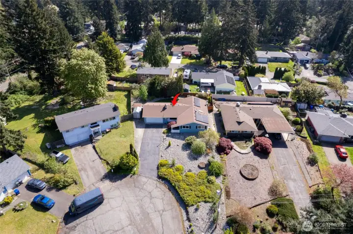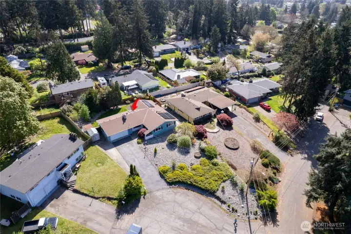 Tucked into a quiet Lakewood cul-de-sac, this well-maintained 1962 rambler offers true one-level living with thoughtful updates throughout. Newly refinished oak floors add warmth and character, while the kitchen features quartz countertops, stainless steel appliances, and a clean, functional layout. With 3 bedrooms and 1¾ baths—including a bath off the primary—this home is both comfortable and practical.Enjoy energy efficiency with solar power helping keep utility costs low. The extra-large 2-car garage provides ample space for parking, storage, or hobbies, and the large shed is perfect for garden tools and additional storage. Step outside to a private backyard—ideal for relaxing, entertaining, or simply enjoying a quiet moment.Just 5 minutes from American Lake Park and only 8 minutes to the freeway, this home offers both convenience and a peaceful setting—delivering comfort, efficiency, and easy living.