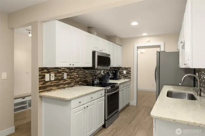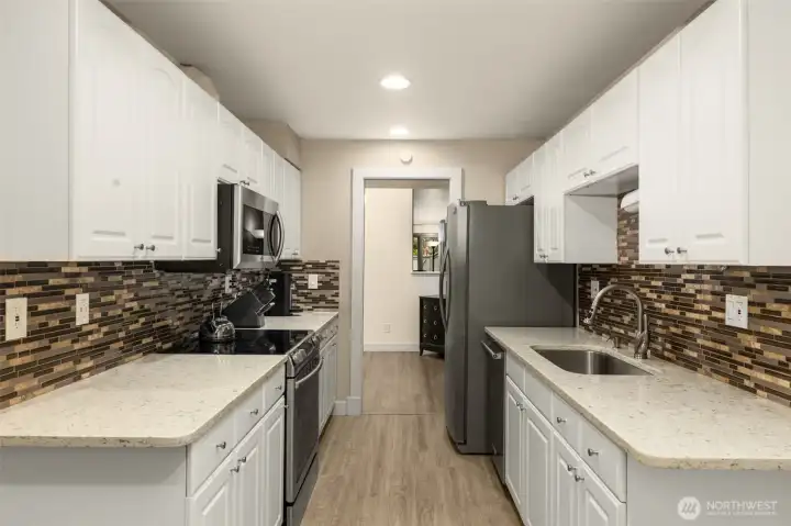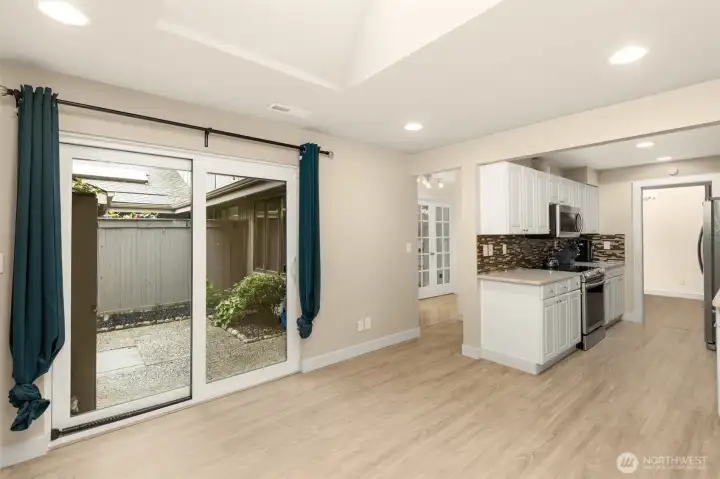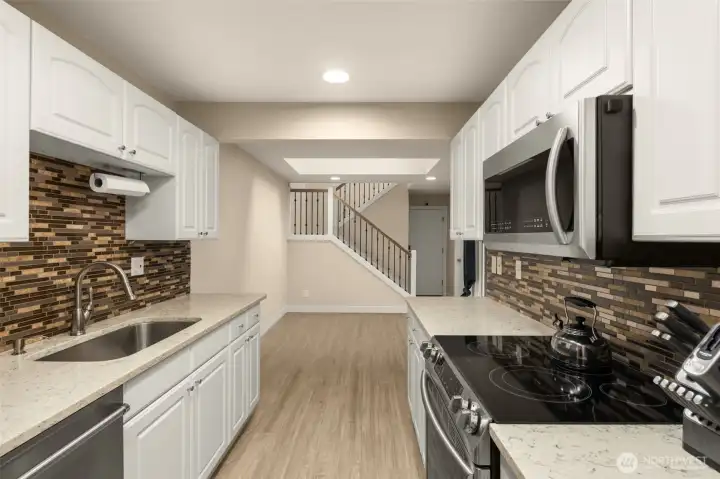 Woodcreek townhome featuring a stylishly updated kitchen with quartz countertops, tile backsplash, and stainless steel appliances, complemented by updated flooring, windows, doors, hardware, and a beautifully refreshed interior with new paint throughout. Vaulted ceilings, skylights, and abundant natural light enhance the airy, open-concept living space. Spacious primary suite with a freshly remodeled bathroom appointed with modern finishes. Private patio, 2-car garage, and access to clubhouse, pool, sauna, and tennis courts—ideally located just minutes to downtown, freeways, and shopping in a pet-friendly community.