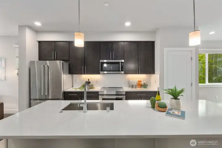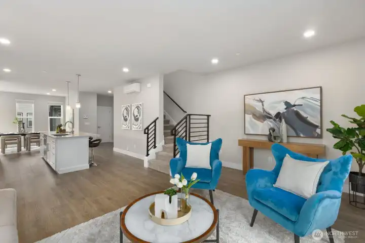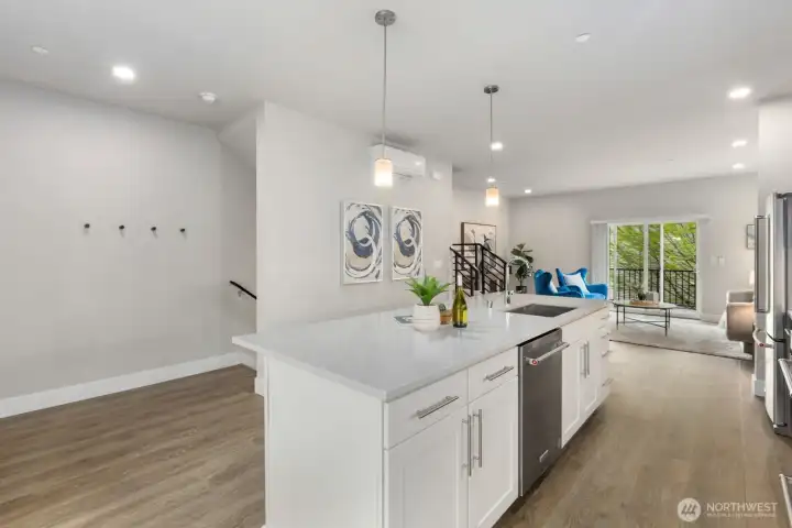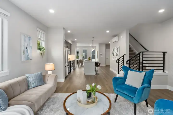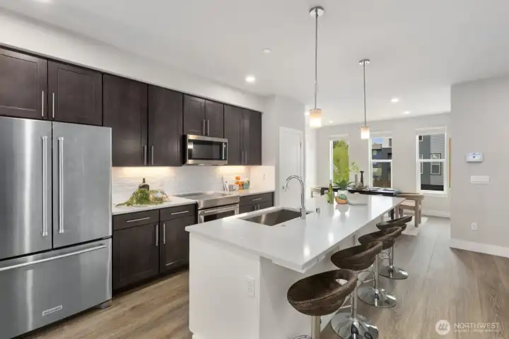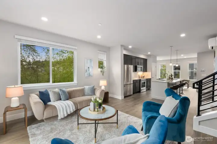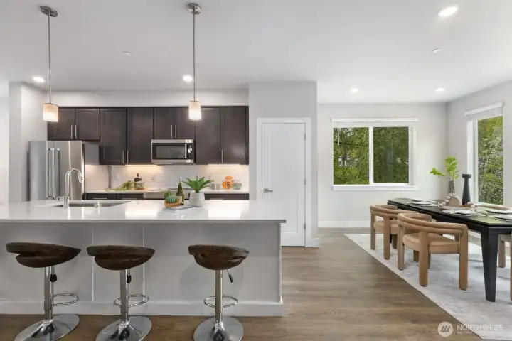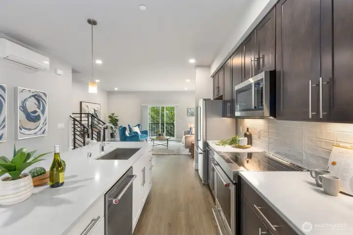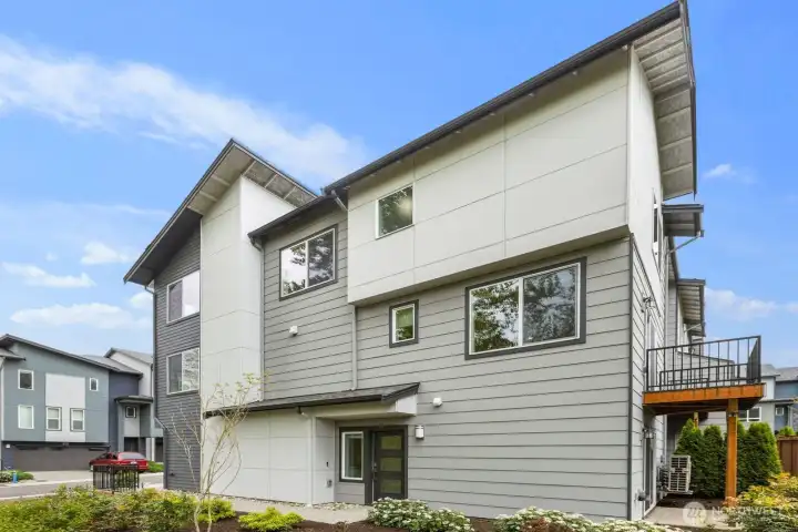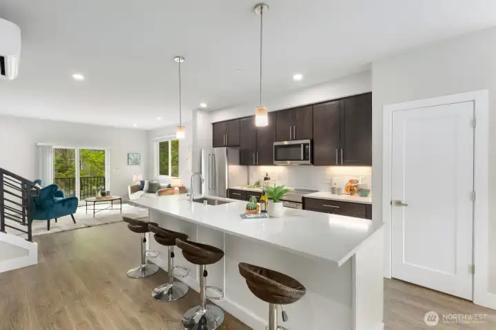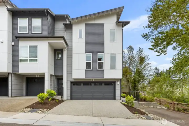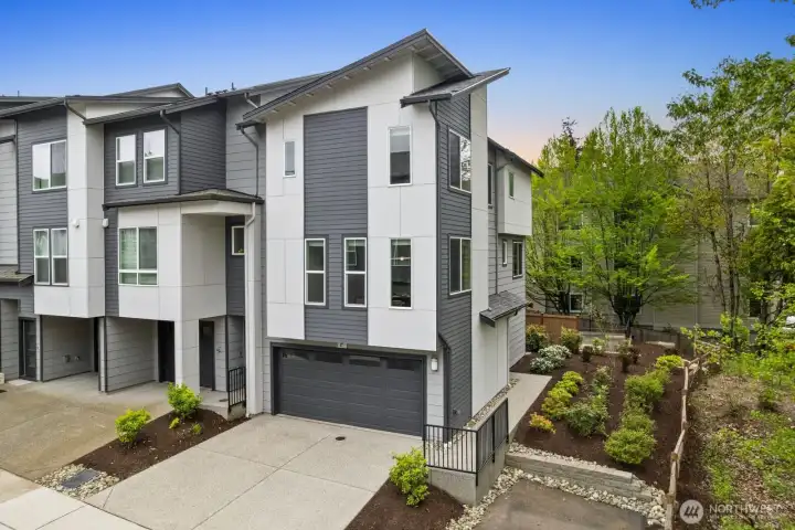 Welcome to this like-new 4-bed, 3-bath townhome! This end unit offers exceptional privacy and abundant natural light throughout. Thoughtfully-designed open layout features elegant finishes and bright living spaces. The generous great room on the main floor leads out to your private deck. Modern chef's kitchen boasts stainless steel appliances, two-tone cabinets, large island, under-cabinet lighting, pendant fixtures and quartz countertops. Entry-level bedroom and ¾ bath with a shower offers flexibility for guests, multi-generational living, or the perfect home office! Upstairs, the primary suite includes a luxurious ensuite with dual vanity, tile shower, and walk-in closet, along with two additional bedrooms and a full bath. Interior highlights include laminate hardwood flooring, ceramic tile, and wall-to-wall carpeting. Enjoy a two-car garage, energy-efficient mini-split heating & cooling, smart home features, EV charging capability, and a prime location near I-405, I-5, top-rated Northshore schools, shops, dining, and community trails.